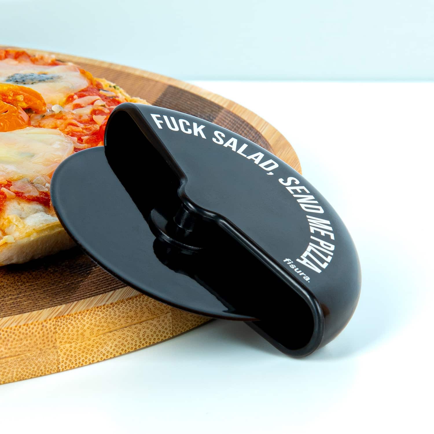 Kiezen tussen een salade of pizza is een eitje toch? Dat vinden de designers van Fisura ook! Vandaar dat ze de Fuck Salad pizzasnijder hebben ontworpen. Dit vlijmscherpe pizzawiel rolt moeiteloos door dunne en dikke bodems en heeft ook geen problemen met plakkerige kaas. Op het handvat staat de tekst: fuck salad, send me pizza.