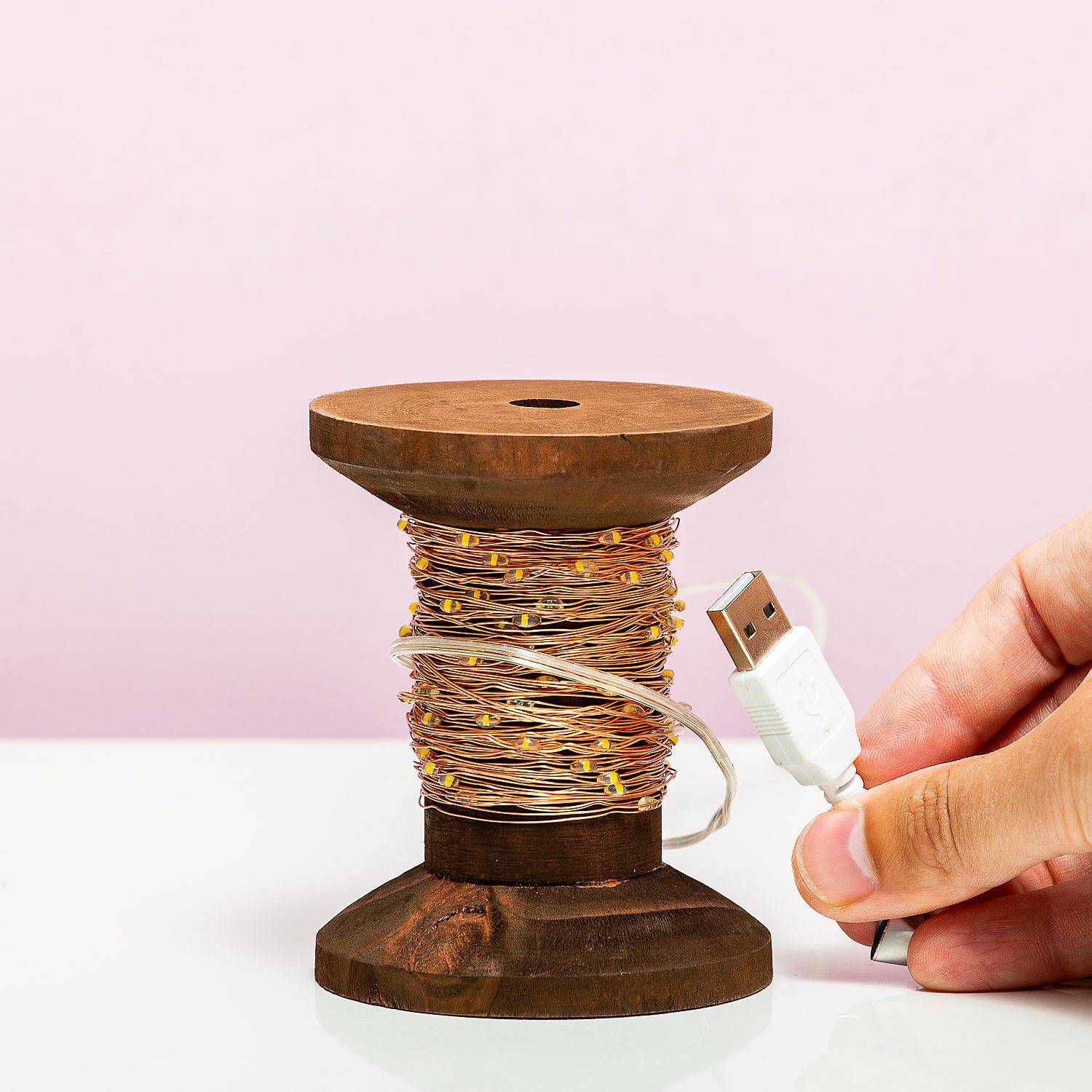 Vrolijk je naai-, slaap- of woonkamer op met de Garenklos fairy lights van Winkee! Deze originele lamp ziet eruit als een houten klos garen. Maar in plaats van garen zit er rond deze klos een koperkleurig snoer met fairy lights gewikkeld. De lampjes kun je om de klos laten zitten, maar ook uitrollen en bijvoorbeeld in een boekenkast leggen of gebruiken om het hoofdeind van je bed te decoreren. Het lichtsnoer is leverbaar met een aansluiting voor op netstroom of USB.