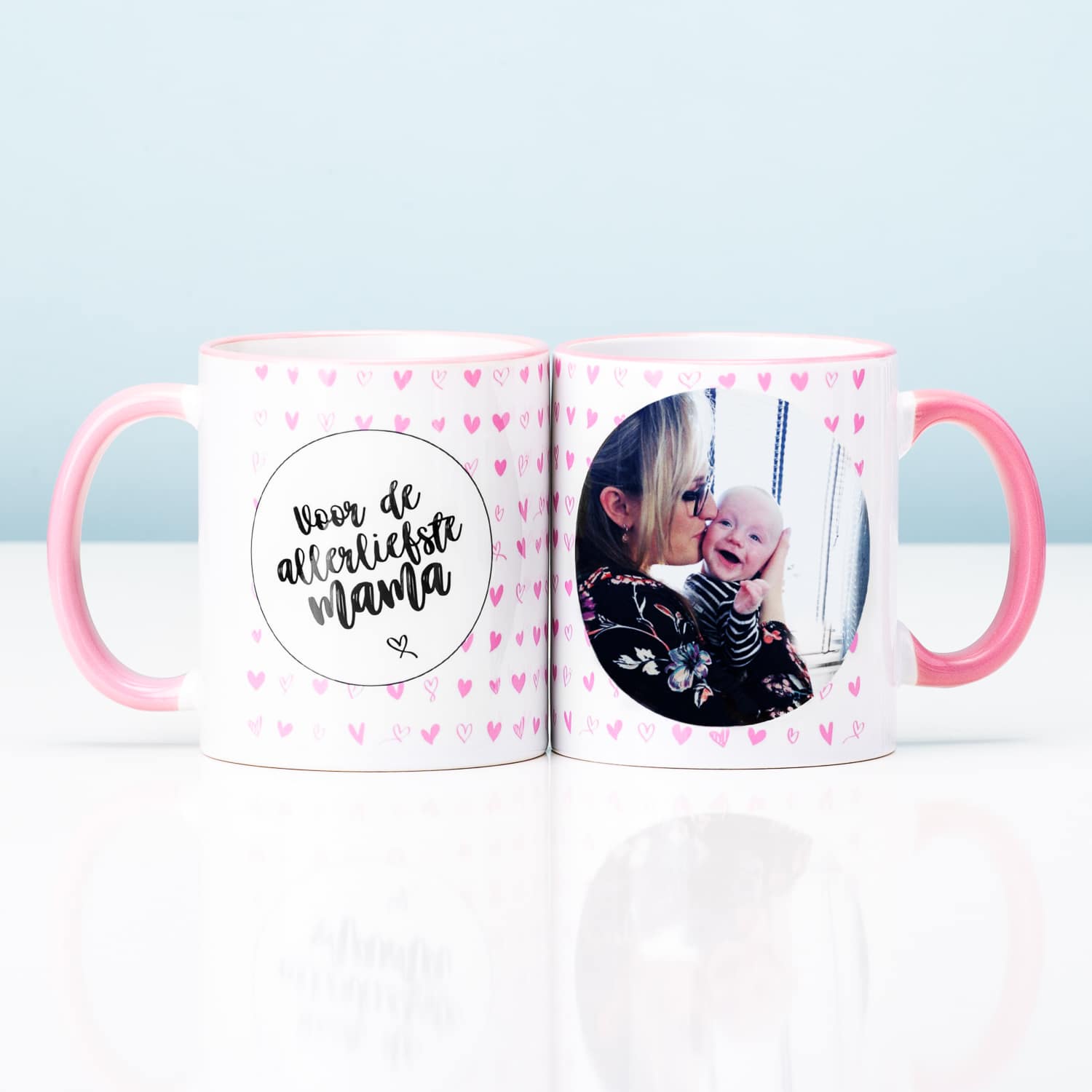 Fotomok met hartjes, een eigen foto en de tekst: voor de allerliefste mama. Originele fotomok om cadeau te geven aan je moeder voor haar verjaardag of voor Moederdag.