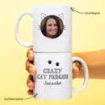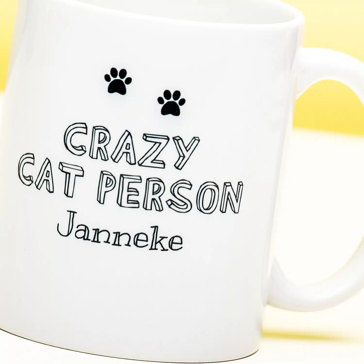 Een crazy cat person: we kennen er allemaal wel één. Zo iemand die liever twintig katten heeft dan een partner. Want katten stellen je nooit teleur, toch? De Gepersonaliseerde mok Crazy Cat Person is het perfecte cadeautje voor een kattenliefhebber. Op deze mok worden zijn of haar foto en naam gedrukt. De foto komt in een kattengezichtje aan de ene kant van de mok, de naam van de ontvanger staat onder de tekst ‘Crazy Cat Person’.