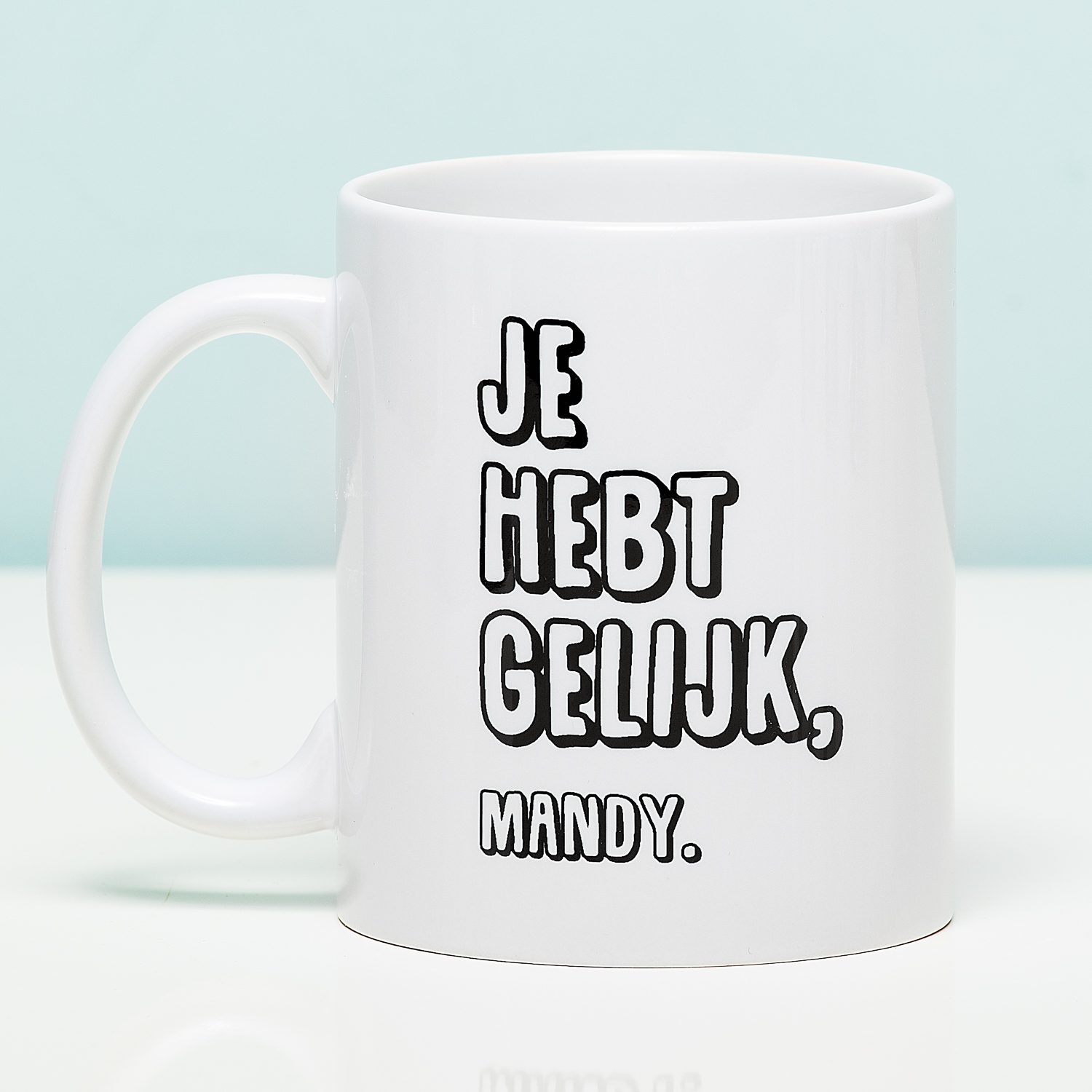 Als je een ruzie goed te maken hebt of gewoon een grappig cadeau zoekt voor je super-koppige vriendin, stop dan maar met zoeken. Je hebt het ultieme kado gevonden! De Gepersonaliseerde mok Je hebt gelijk is het ultieme cadeau voor je eigenwijze vriend, vrouw of zus. De beker is dubbelzijdig bedrukt, want op de achterkant staat: bijna altijd. De mok kun je personaliseren, dus achter het woord gelijk komt lieverd, schat of een andere naam of koosnaam te staan. Je hebt gelijk lieverd. Bijna altijd!