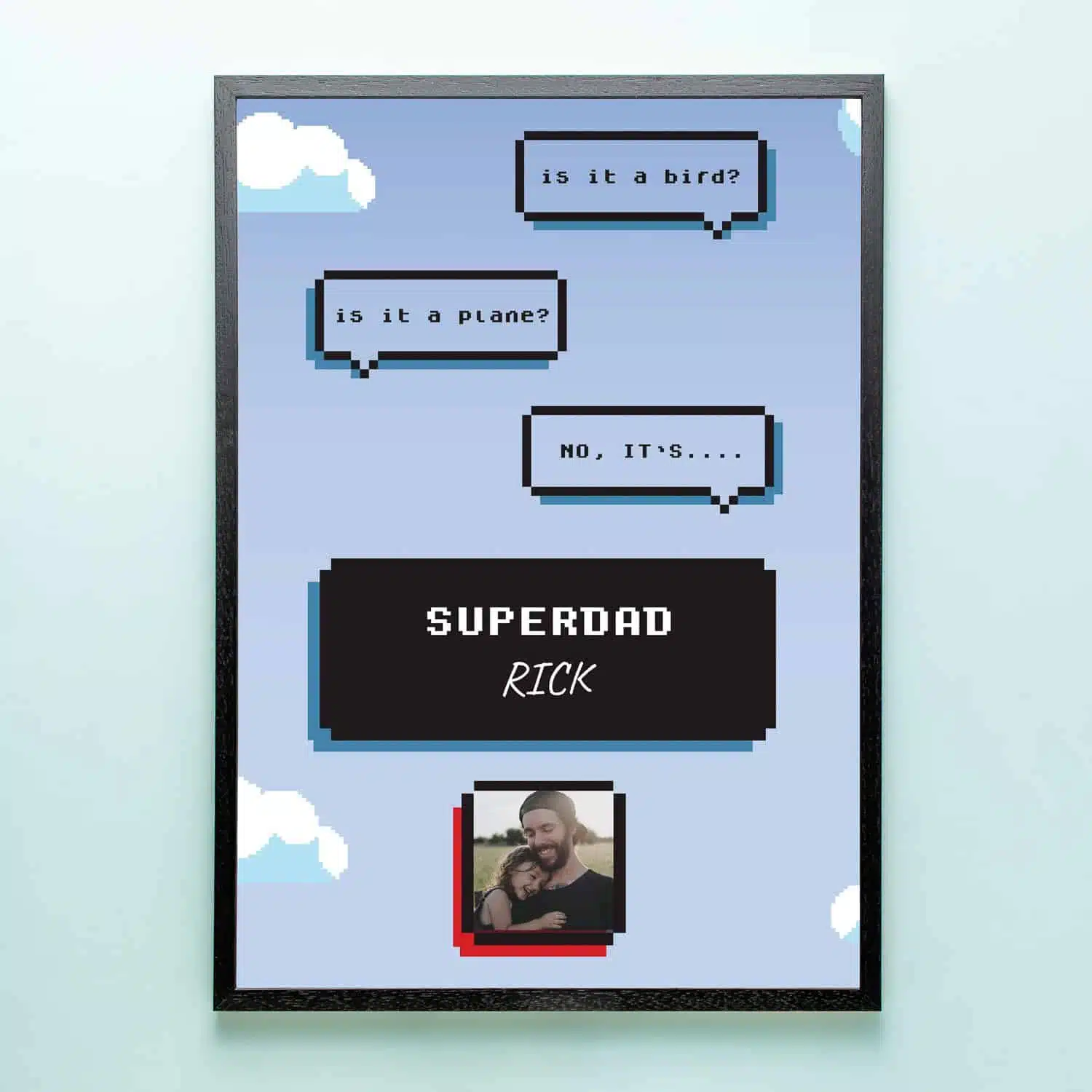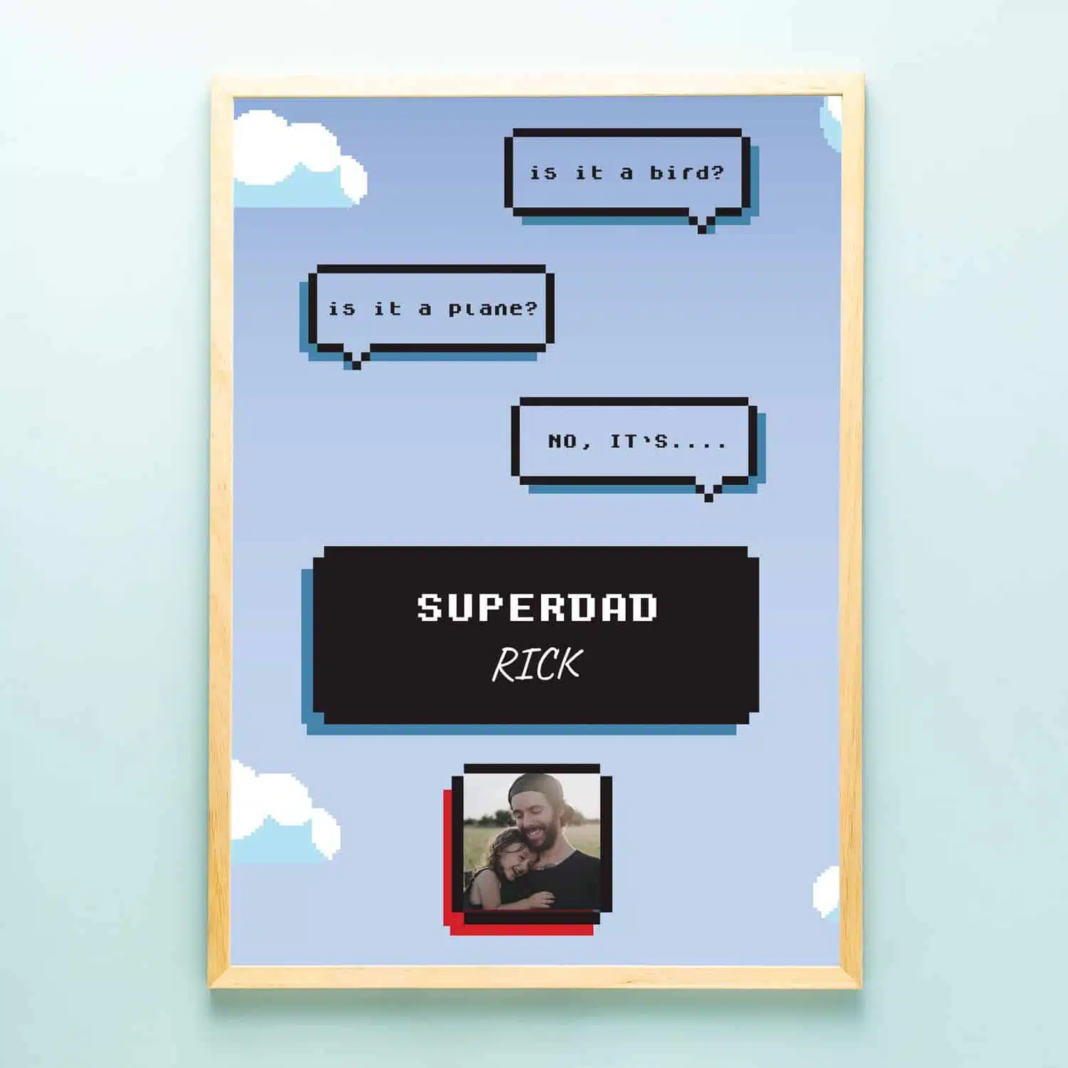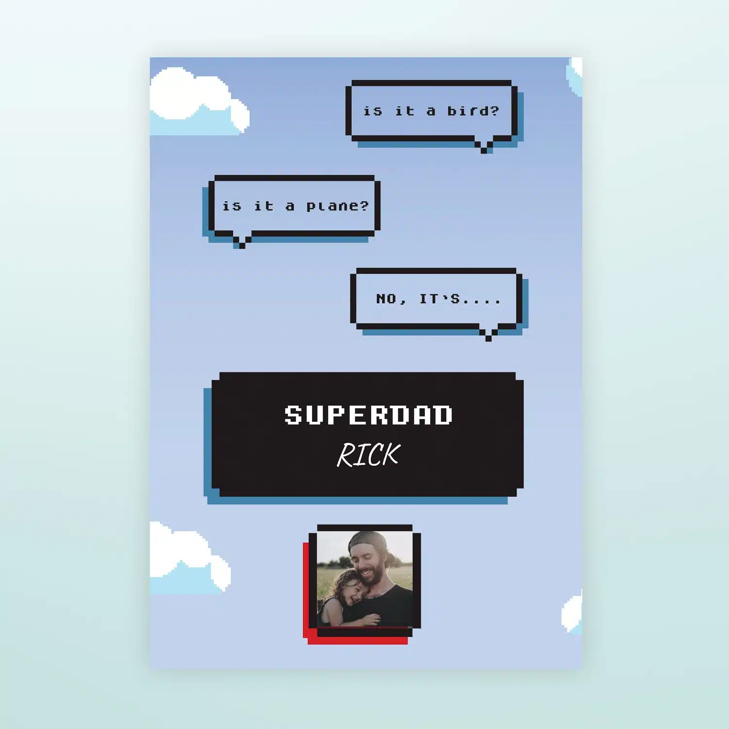Zoals jouw vader is er maar één. En dat is waarom hij een Superpapa is! Deze Gepersonaliseerde poster Superdad laat jouw vader precies weten hoe jij over hem denkt. Op de poster – in pixel-thema – staat drie tekstwolkjes met de tekst: is it a bird? is it a plane? NO, IT’S… Daaronder staat een badge: SUPERDAD! Hier weer onder komt de naam van jouw vader én zijn foto. Een super lief en grappig cadeau voor Vaderdag of zijn verjaardag.