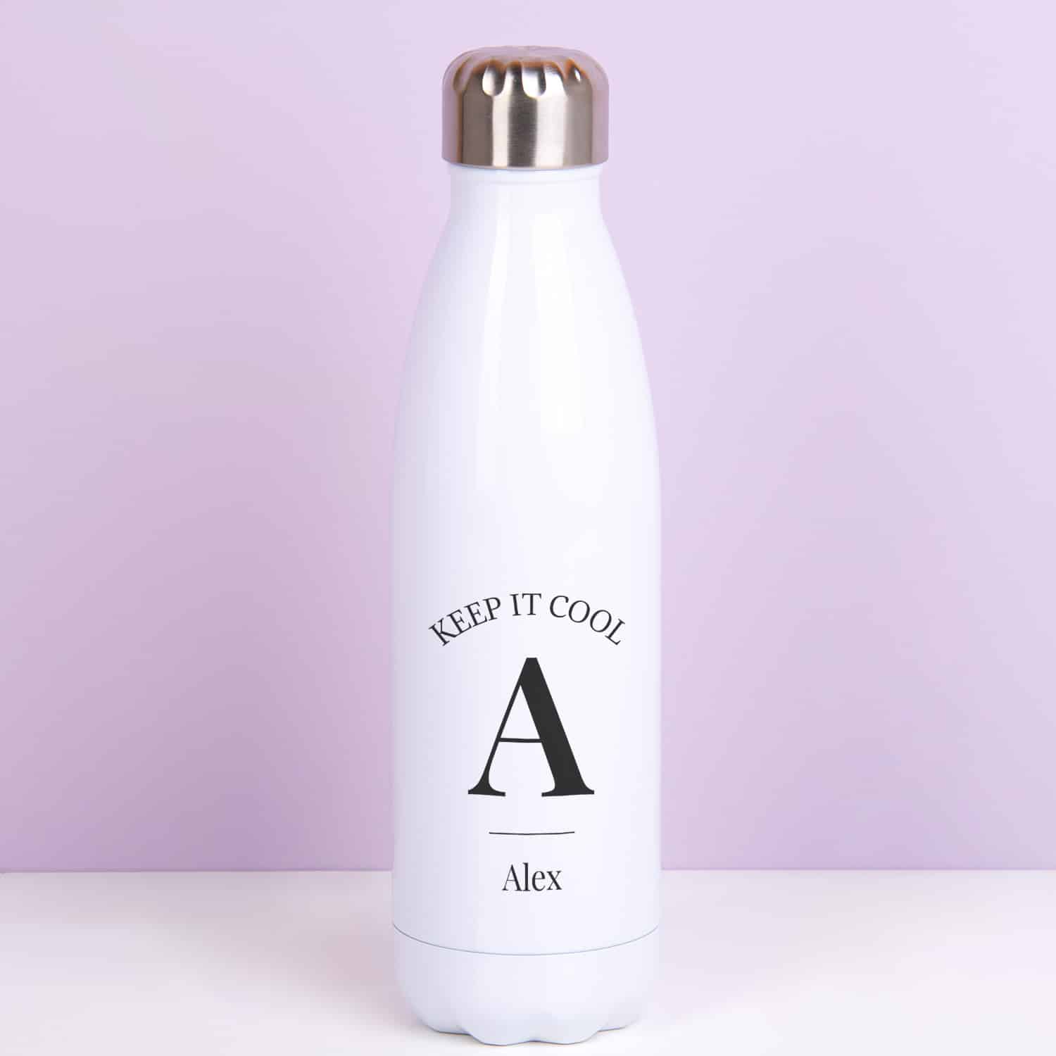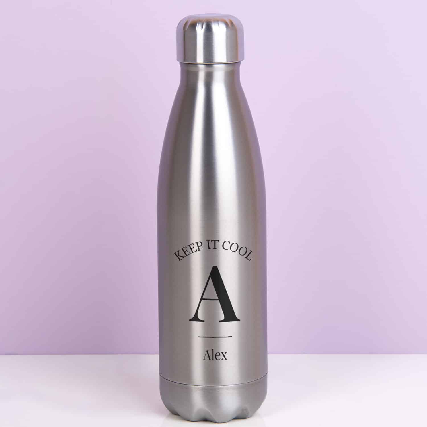 Het kan een uitdaging zijn: je hoofd koel houden. Vervelende collega’s, een huisgenoot die het bloed onder je nagels vandaan haalt of gewoon omdat je in de sportschool staat. De Gepersonaliseerde thermosfles Keep It Cool helpt je om je hoofd koel te houden. Op de fles staat de tekst Keep it cool, met daaronder je voorletter en je naam. De fles houdt ondertussen je drankje ook koel gedurende 24 uur. En doe je er een warme drank in, dan blijft deze 12 uur lang warm.