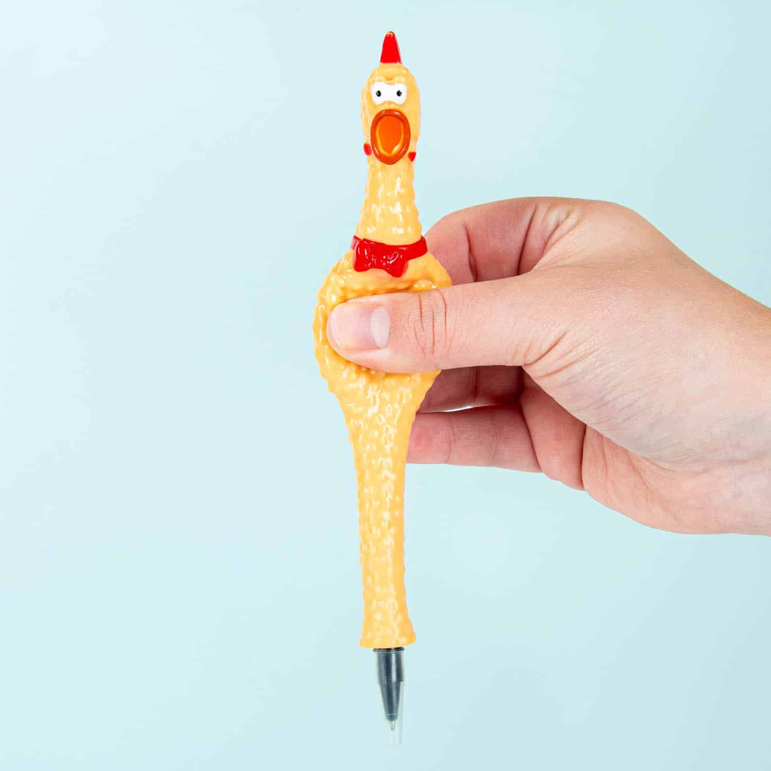 Je kent ze vast wel: de rubberen piepende kippen waar honden mee spelen. De Gillende kip pen is hierop geïnspireerd. Schrijven wordt zo allesbehalve saai. Een grappig hebbeding voor op kantoor of school.