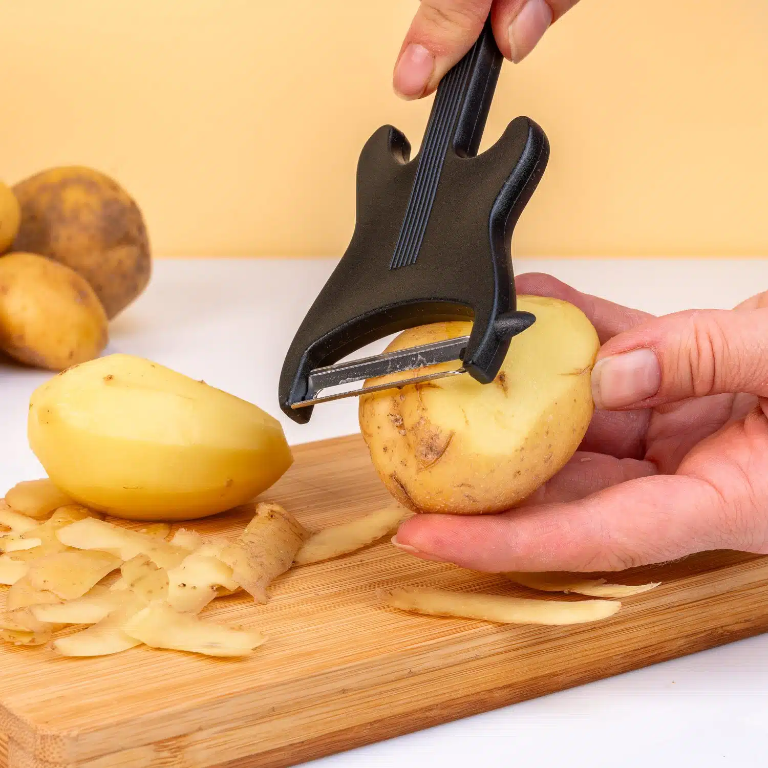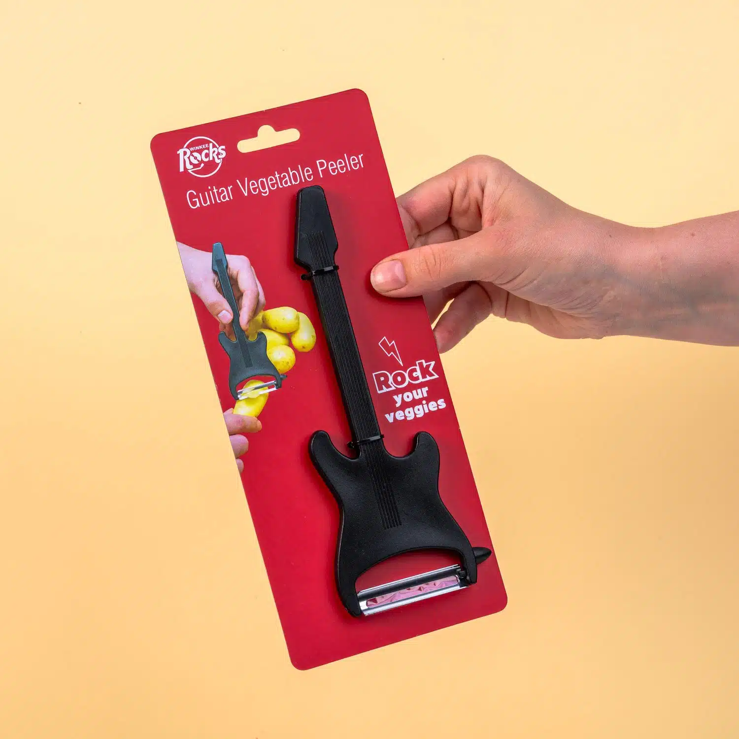 Groenten klaarmaken voelt misschien niet als een stoere bezigheid, maar met de Gitaar dunschiller van Winkee krijgt het toch een heel andere dimensie. Deze coole dunschiller ziet er namelijk uit als een elektrische gitaar. Hiermee rock jij het schillen van de aardappels als geen ander. Maar je kunt hem natuurlijk ook gebruiken om je wortels schoon te maken en dunne plakjes komkommer te schillen.