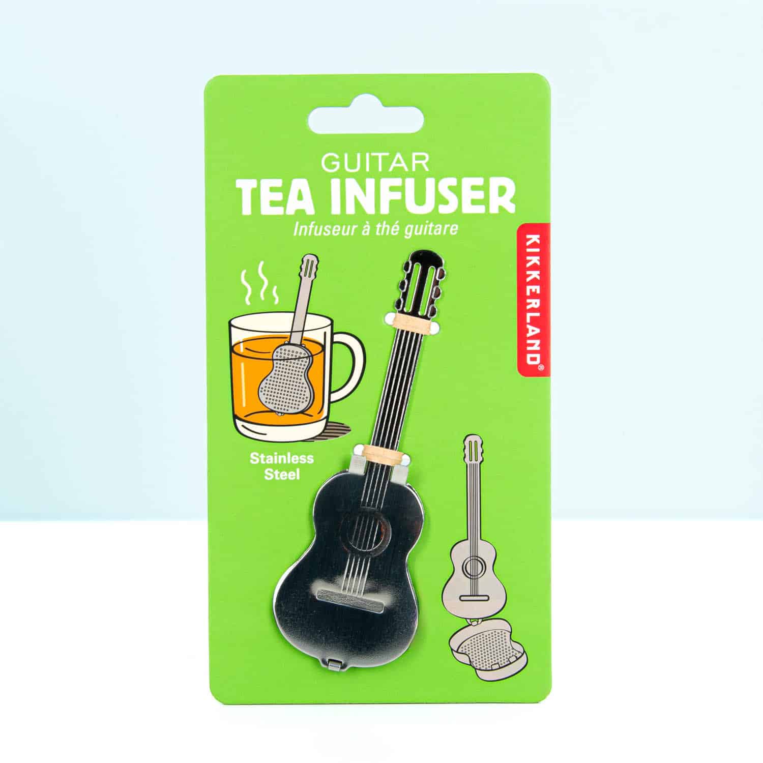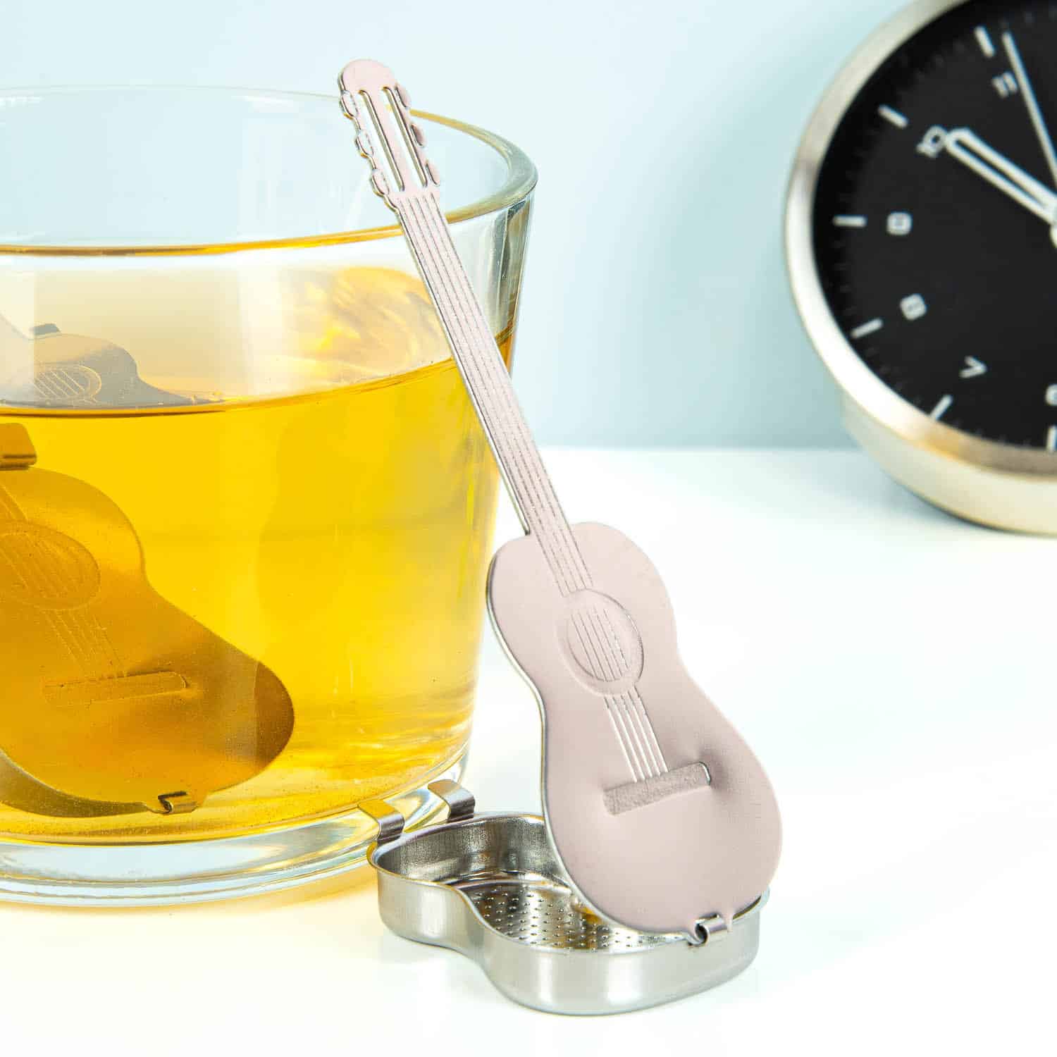 Met dit Gitaar thee-ei van Kikkerland serveer je je thee, vergezeld van een rustgevend akoestisch muziekje. Nou ja, in gedachten dan. Deze tea infuser ziet er namelijk uit als een akoestische gitaar. Doe er losse thee in, zet hem in een kop heet water en laat de thee een aantal minuten trekken. Door de lange hals kun je deze tea infuser makkelijk uit het glas halen.