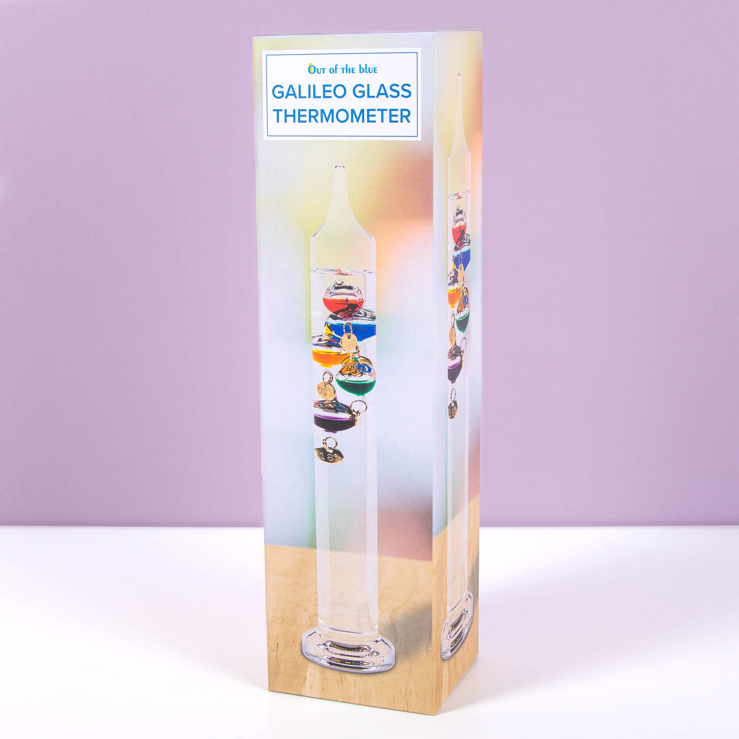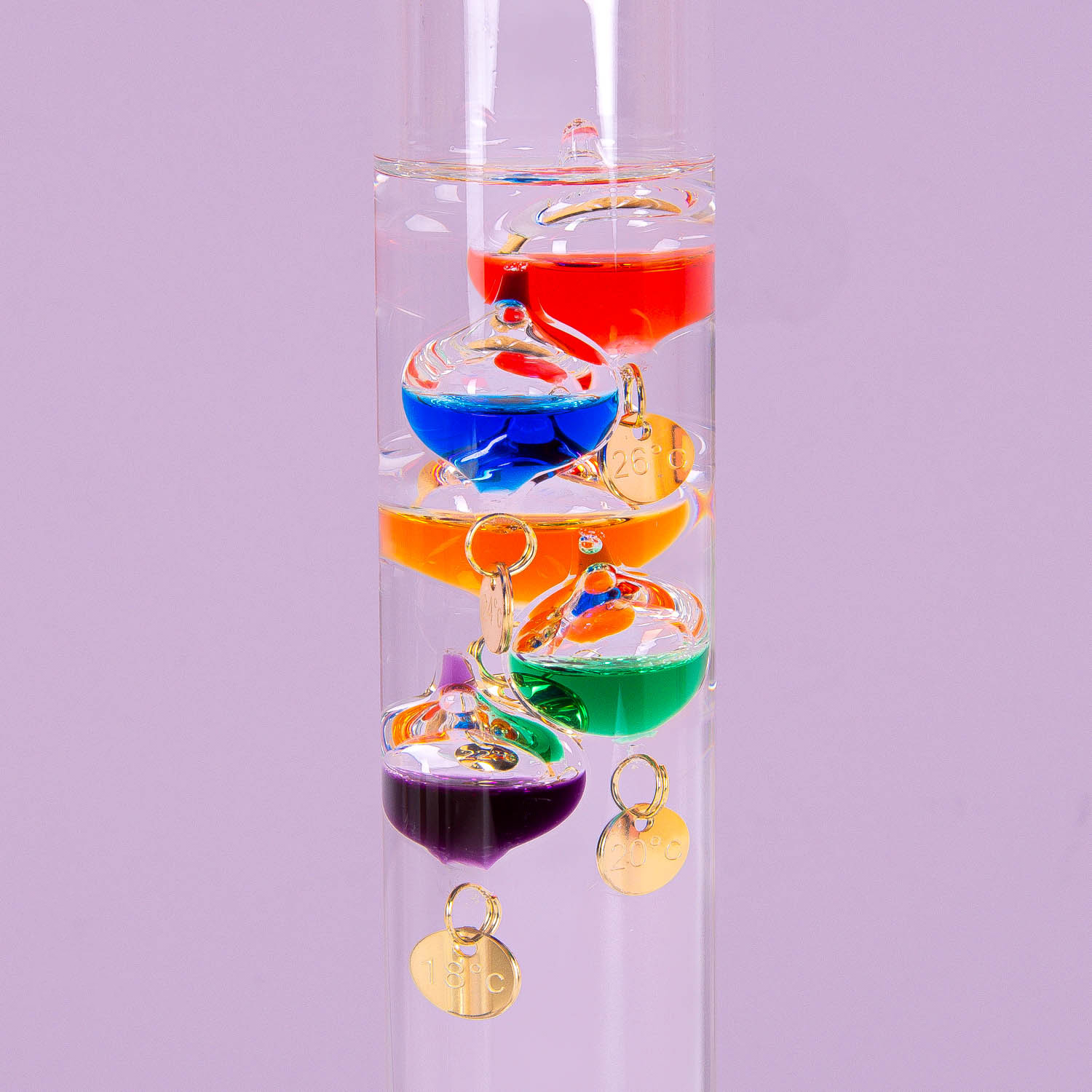 Een Galileo thermometer werkt volgens een slim principe: in de glazen cilinder drijven glazen druppels met gekleurde vloeistof. Elke druppel heeft een iets ander gewicht. Bij een bepaalde temperatuur zinken de zwaardere druppels naar beneden en drijven de lichtere omhoog. De laagste druppel die nog drijft geeft de huidige temperatuur aan. Deze simpele, maar intelligente thermometer is een eyecatcher op je bureau of vensterbank.