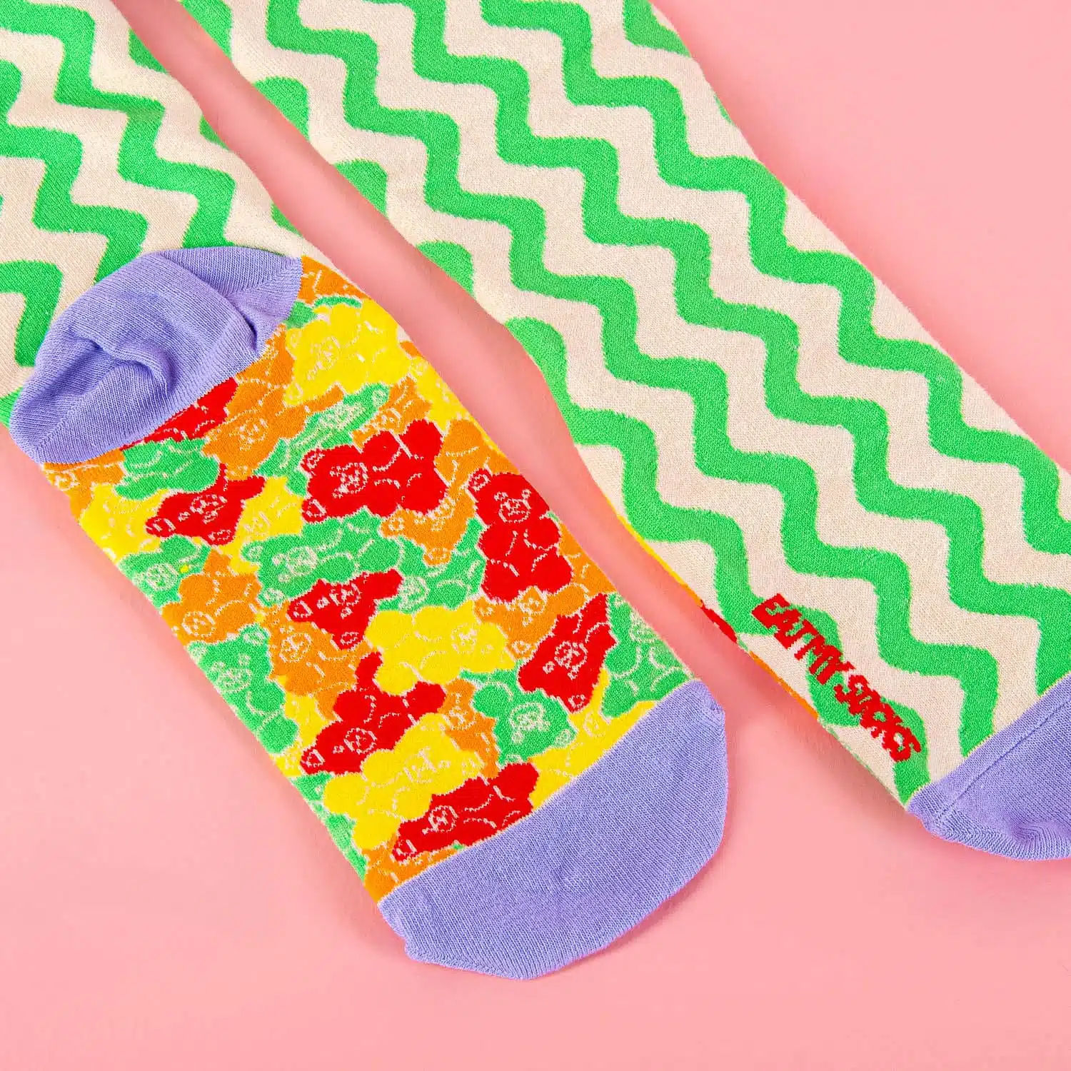 De Gummibeer sokken van Eat My Socks zijn een hilarisch én praktisch cadeautje. Deze sokken lijken op een zakje gummiberen, maar zijn in werkelijkheid toch echt bestemd voor aan je voeten. De sokken hebben een vrolijk lila en groen patroon, met gummiberen op de voetzolen. Het zijn de ideale sokken om een serieuze outfit een vrolijke upgrade te geven.
