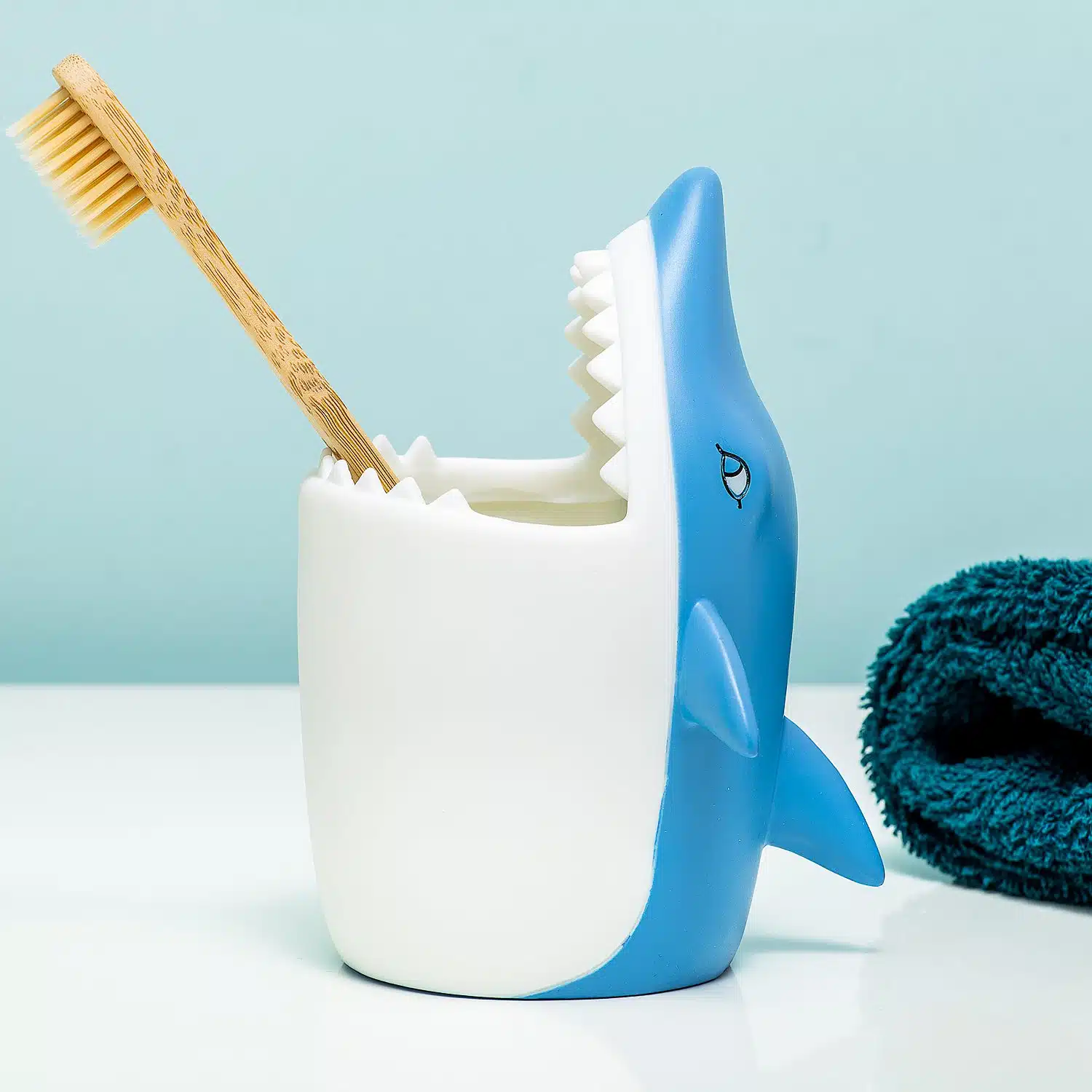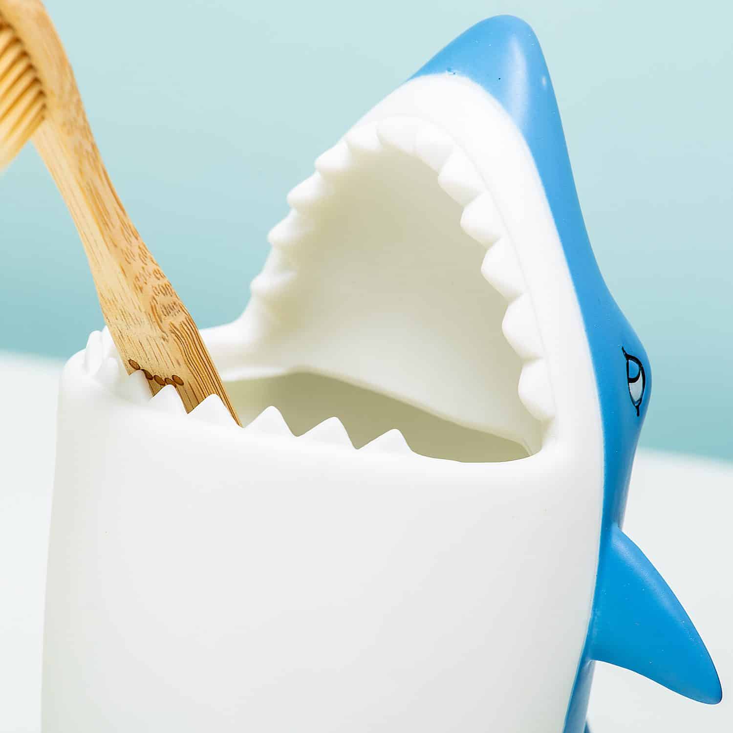 Is het elke avond een uitdaging om je kind zijn tanden te laten poetsen? Of heb je gewoon een plekje nodig voor rondslingerende tandpastatubes? De Haai tandenborstelhouder van Winkee is een grappige beker in de vorm van een haai om je tandenborstel in op te bergen. De haai laat zijn blinkend witte tanden graag zien en biedt voldoende ruimte voor meerdere tandenborstels en een tube tandpasta.