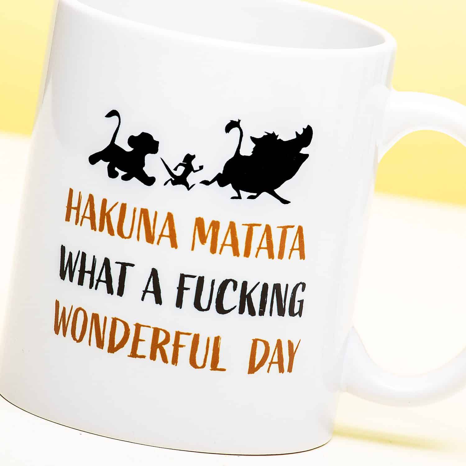 Heb jij net zo’n positieve instelling als Timon en Pumbaa uit The Lion King? Geniet jij van elke dag? Straal wat van deze positiviteit uit met de Hakuna Matata mok. Op deze vrolijke beker staan Timon, Pumbaa en Simba, samen met de tekst: Hakuna Matata. What A Fucking Wonderful Day. De mok is perfect om iedereen te laten weten dat het weer een probleemvrije, positieve dag is.