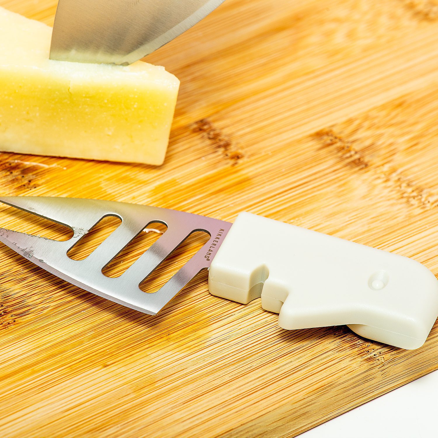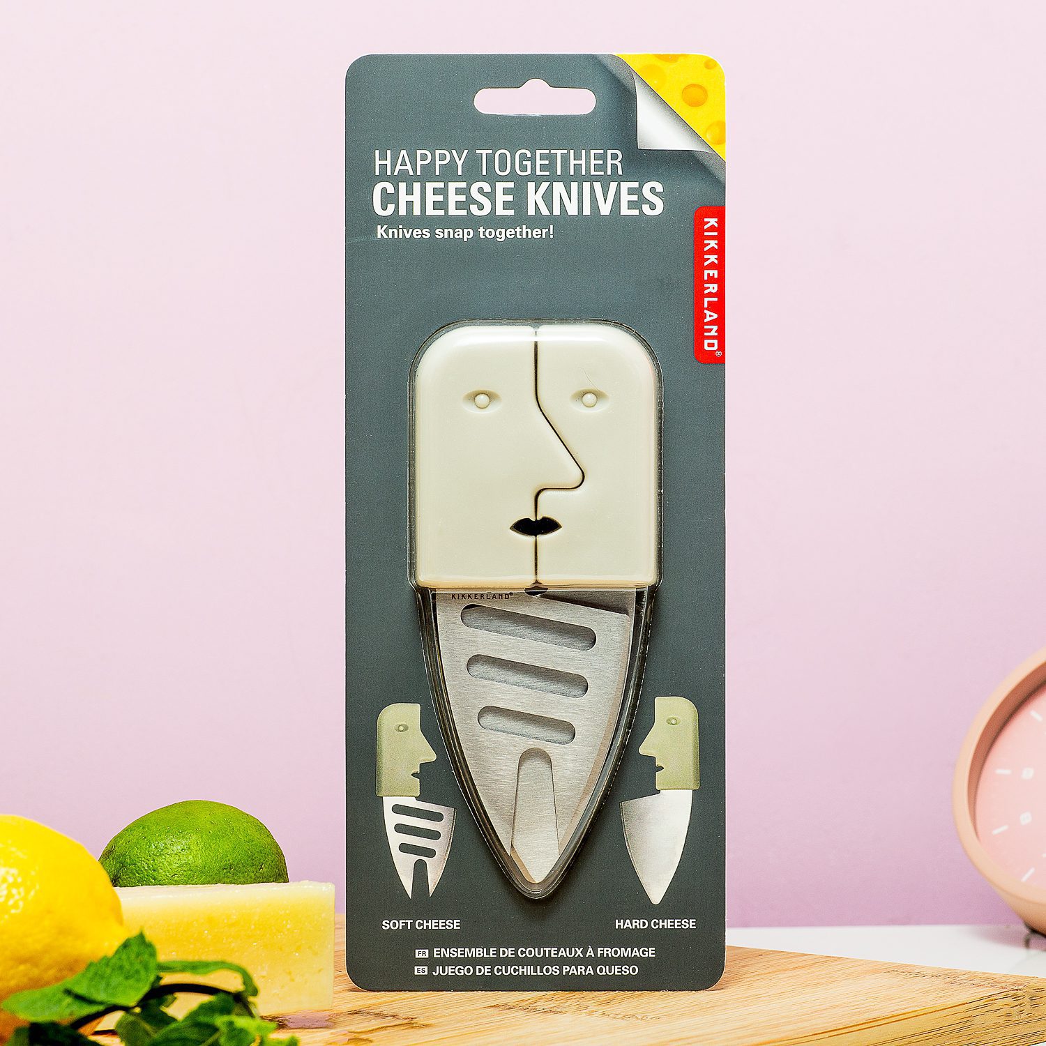 Maak je borrelplank extra vrolijk, met de Happy Together kaasmessen (set van 2) van Kikkerland. Deze twee kaasmessen hebben een uniek handvat: ze zien eruit als een abstract gezicht. En het leuke is dat je de messen, één voor harde en één voor zachte kaas, in elkaar kunt schuiven om op te bergen. Zowel op je borrelplank als in de keukenlade zijn ze happy together.