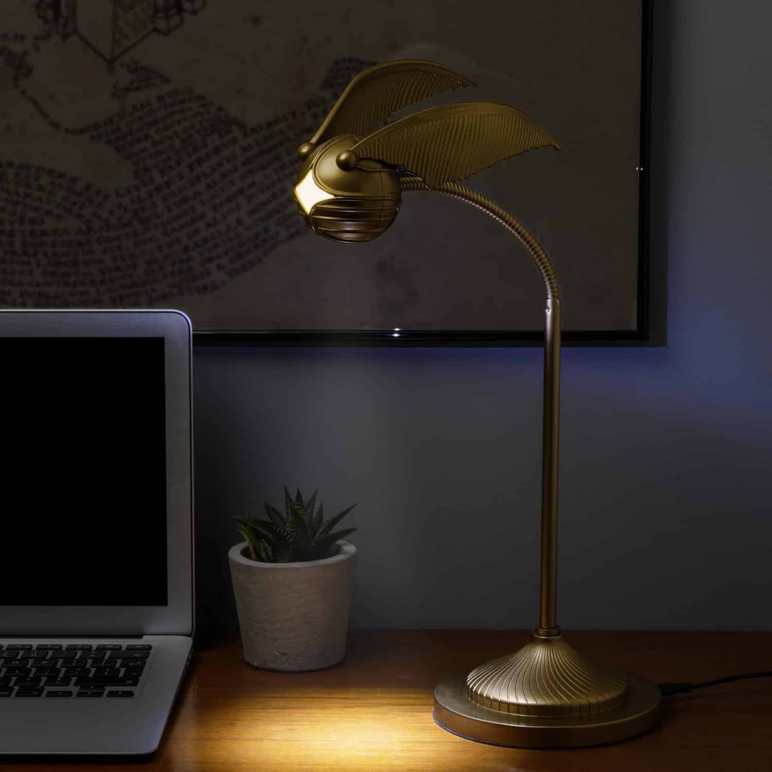 De gouden bal van de Golden Snitch bureaulamp van Harry Potter lijkt zo uit een Quidditch-wedstrijd te zijn weggevlogen. Hij heeft een flexibele steel waarmee je het licht precies richt waar je het nodig hebt.
