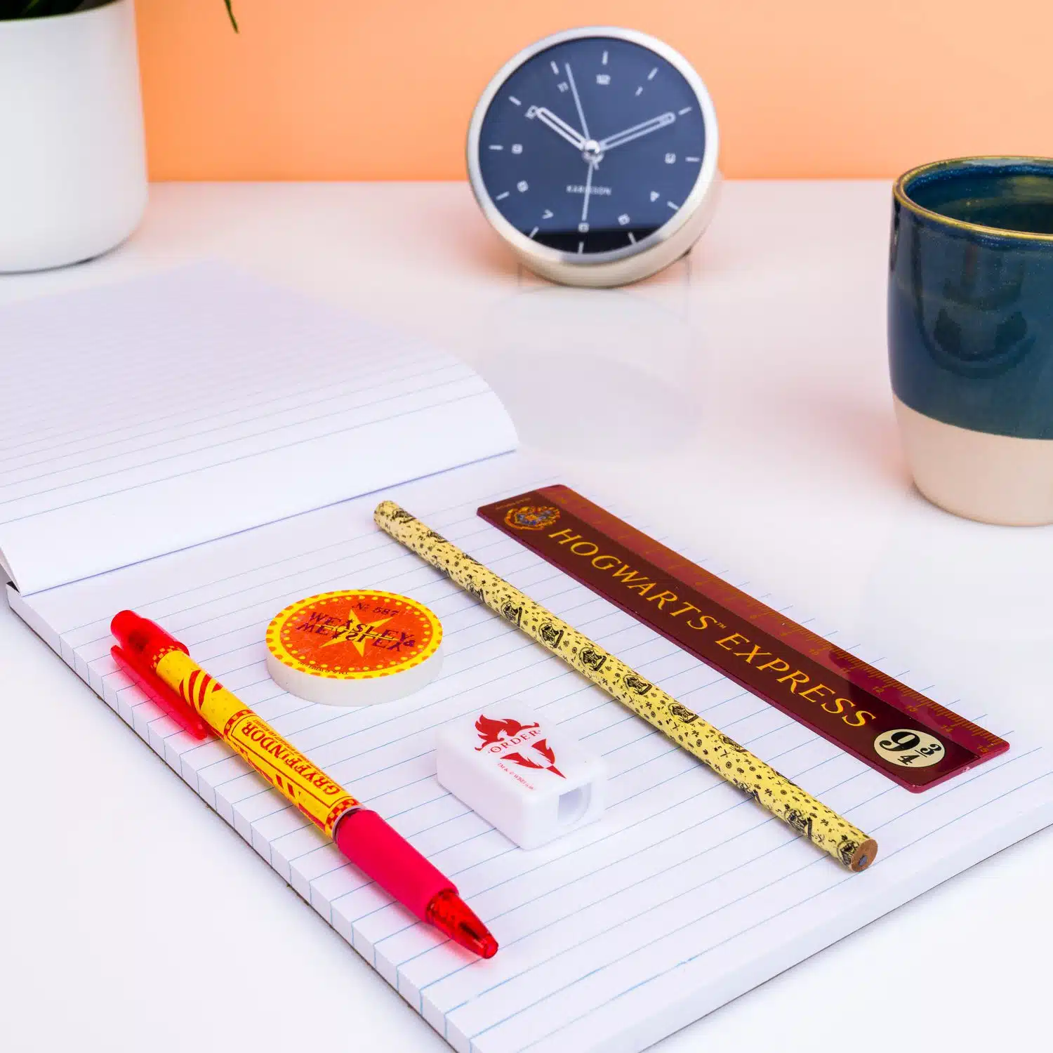 Wat is er leuker dan met Harry Potter naar school gaan? Neem je favoriete boekkarakter gewoon mee in je etui. De Harry Potter schrijfset (set van 5) bestaat uit vijf bureauaccessoires waar je eigenlijk niet zonder kan. In de set zit een liniaal, potlood, pen, gum en puntenslijper. Daar wordt wiskunde een stuk leuker mee, dat beloven mee.