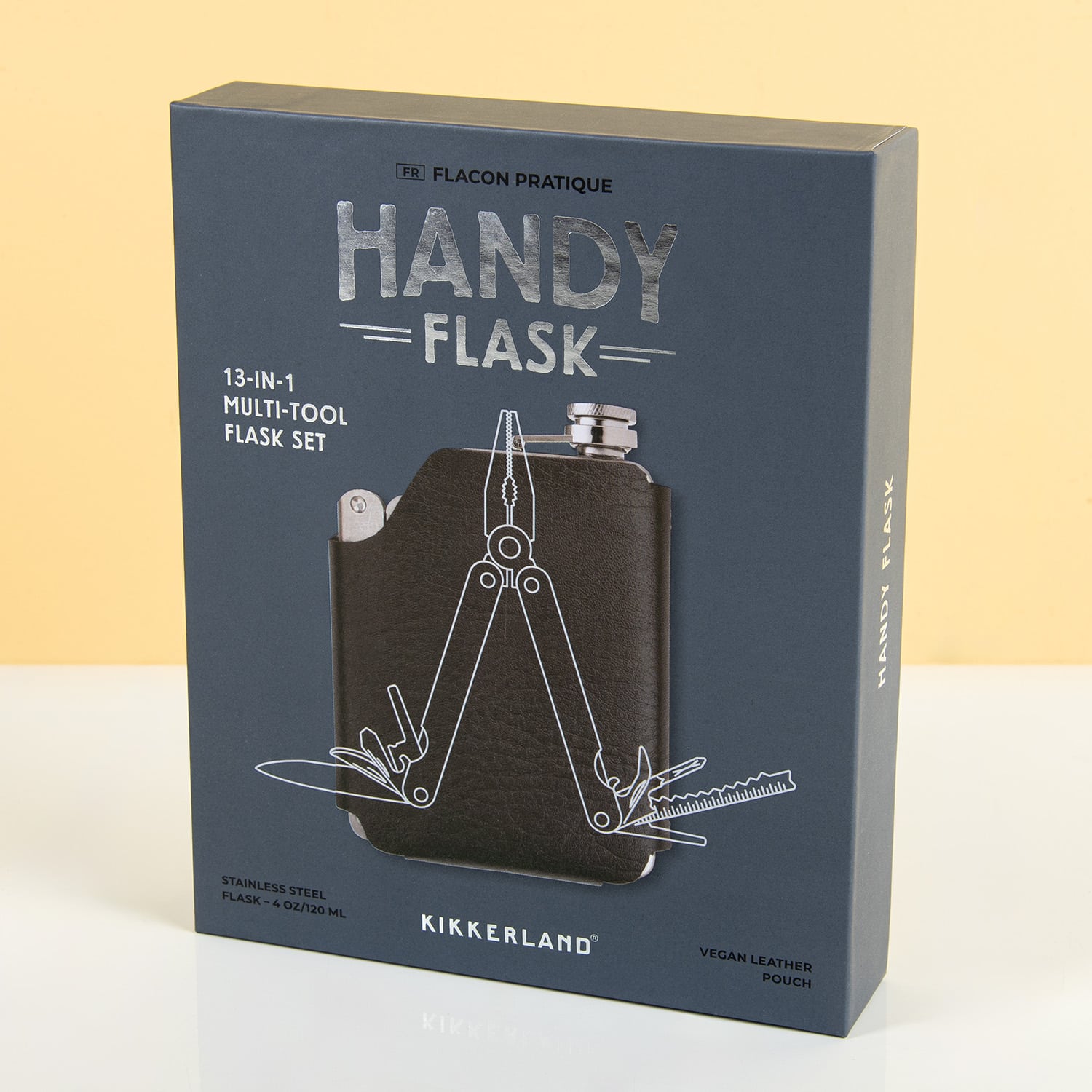 Work hard, play hard. Is dat jouw motto? Dan past de Heupflacon en multitool set van Kikkerland zeker bij jou. Deze originele cadeauset bestaat uit een multitool – waarmee je de noodzakelijke klusjes kunt doen – en een heupflacon om nadien lekker te ontspannen. De multitool bevat twee mesjes, tangen, platte- en kruiskopschroevendraaiers, een flesopener, zaagje en meer. De hoes waarin de multitool en heupflacon zitten in gemaakt van vegan leer.