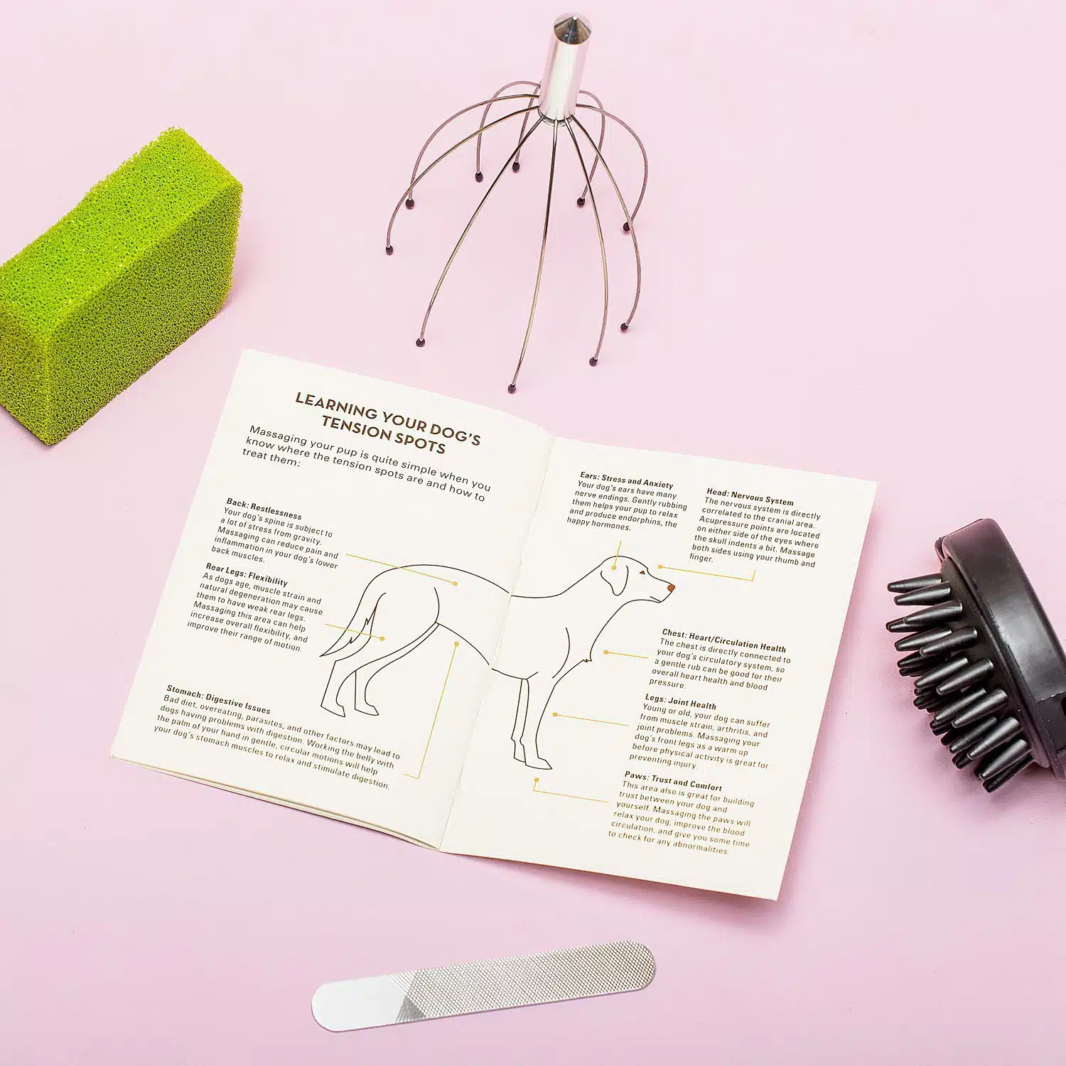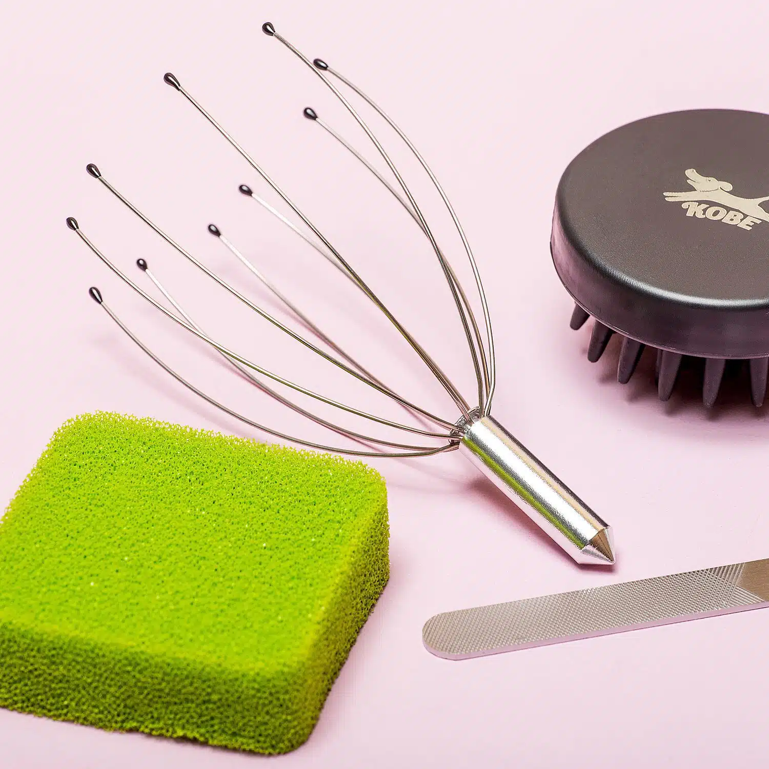 - Met mini massagespin, borstel, nagelvijl en sponsje om haren te verwijderen