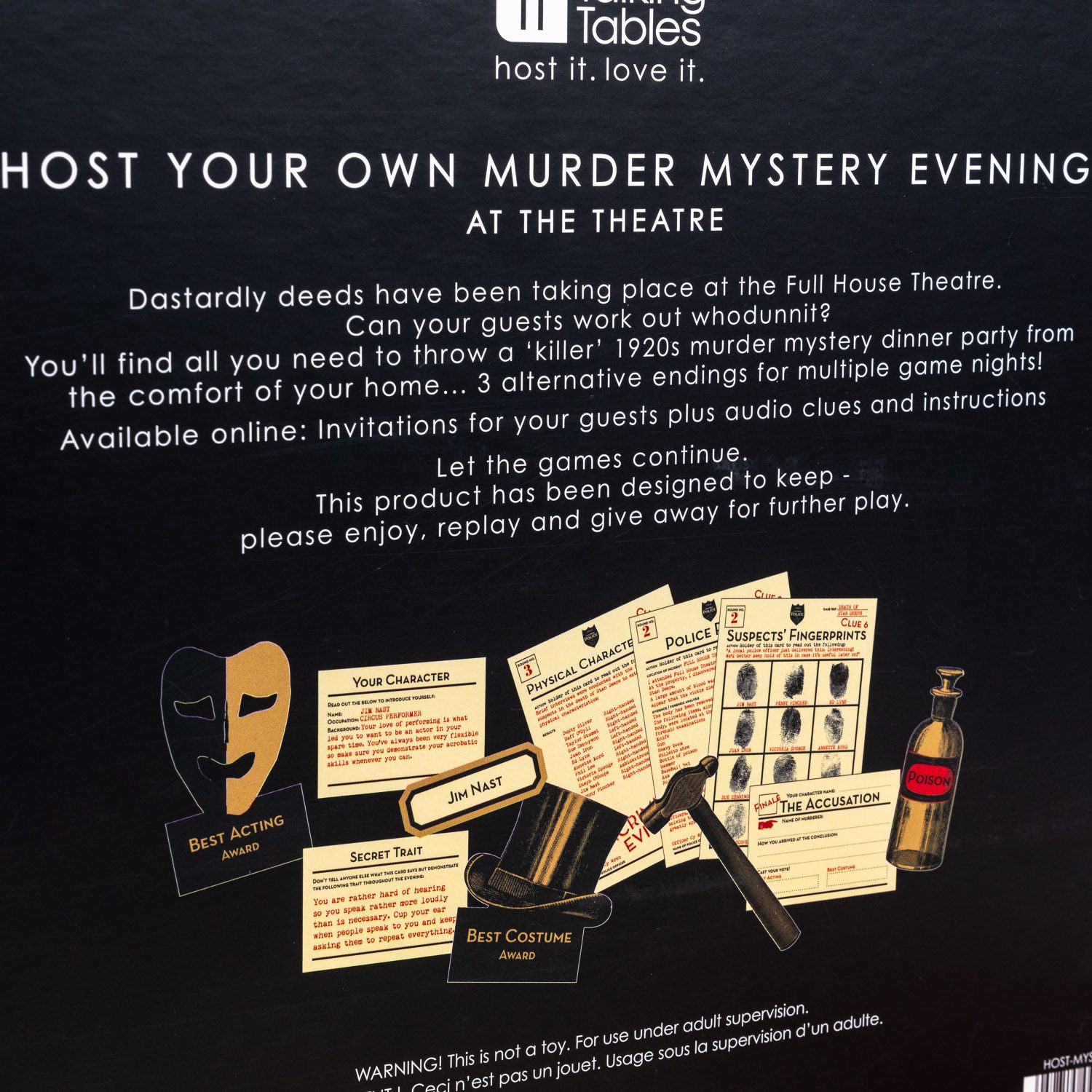 Ben je dol op spelletjesavonden met vrienden, dan hebben we iets leuks voor je: het Host Your Own Murder Mystery spel. Bij dit spel van Talking Tables is het de bedoeling om een moordmysterie op te lossen. Het spel speelt zich af in de jaren 20 van de vorige eeuw: er is een moord gepleegd in het theater en jij moet raden wie het heeft gedaan. Een origineel spel, waarbij je niemand kan vertrouwen!