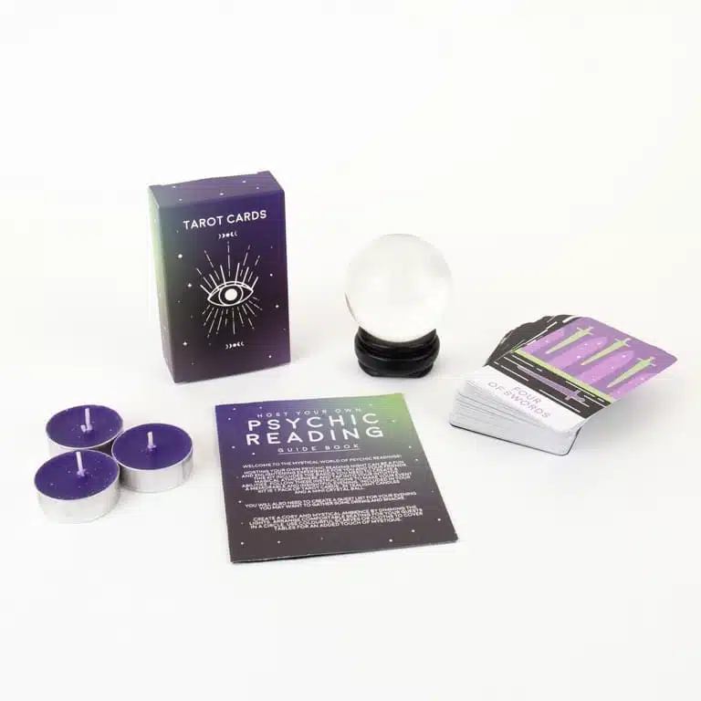 Wil je weten wat de toekomst brengt? Met Host Your Own Psychic Reading van Gift Republic ga je zelf aan de slag als mystieke ziener. Deze complete kit bevat alles wat je nodig hebt: instructies, een mini kristallen bol voor scrying, drie geurkaarsen voor de perfecte sfeer én een volledig tarotdeck met 78 kaarten. Perfect voor wie nieuwsgierig is naar spiritualiteit, voor je vriendin die al haar kristallen verzamelt, of gewoon voor een mystieke avond met vrienden. De toekomst wacht op je!