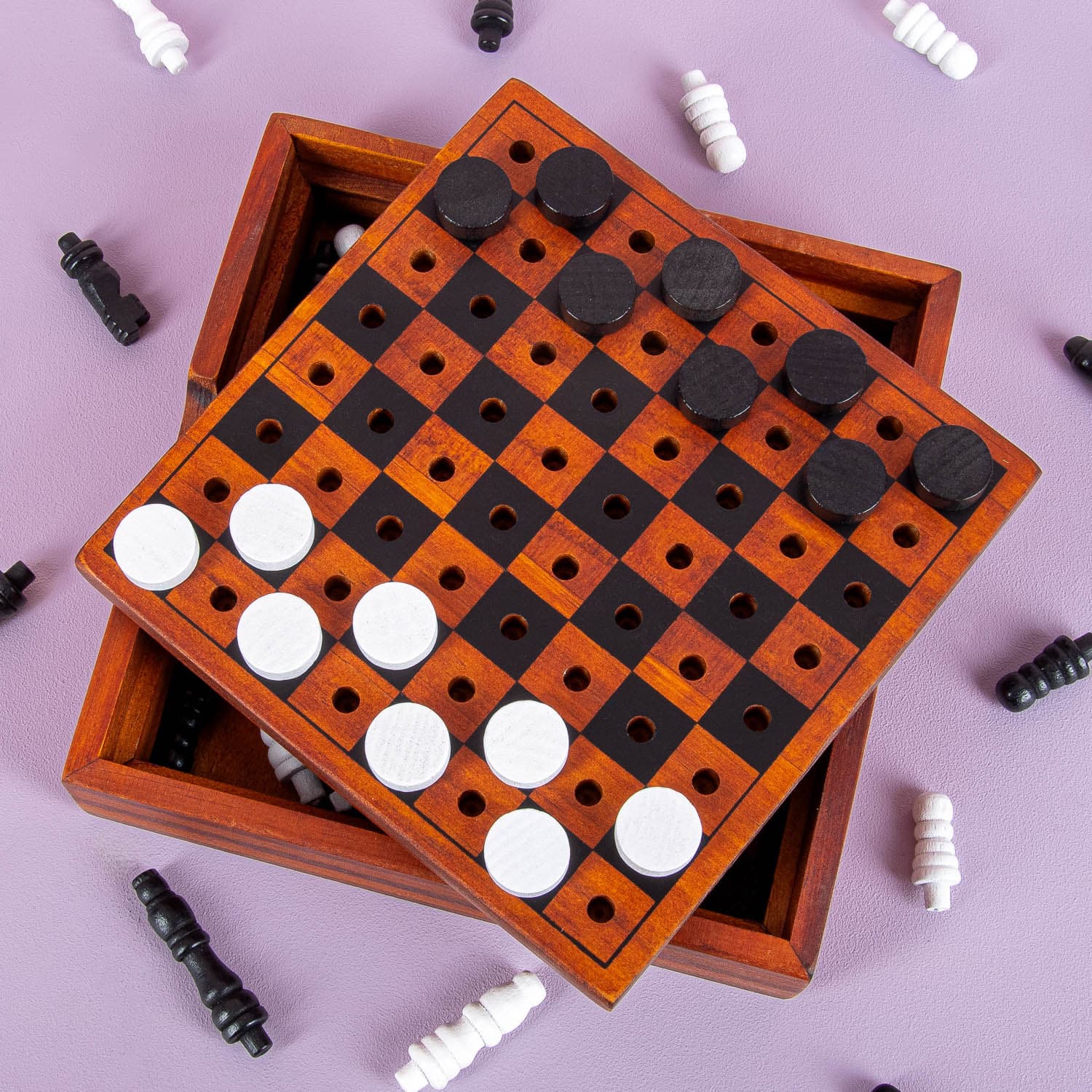 Kies voor luxe speelplezier, met het Houten dam- en schaakspel van Iron & Glory. Je kunt het thuis én onderweg gebruiken, want dit compacte spel bestaat uit een houten verpakking, met daarin schaak en damstukken. Het deksel is tegelijkertijd het speelveld, waar je de schaakstukken in kunt steken. Een mooi cadeau, dat ook prachtig staat op je bureau.