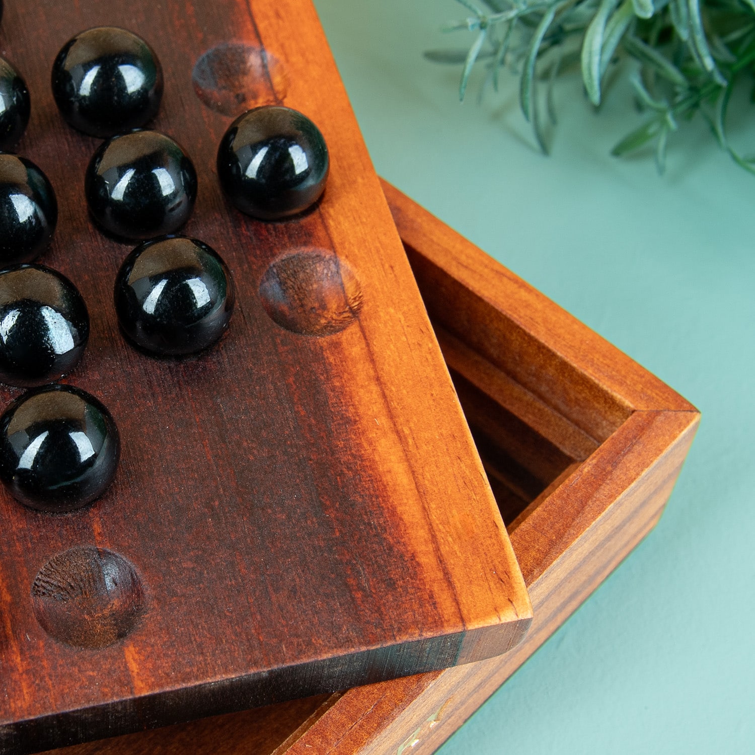 Houten solo noble of solitaire spel, waarbij je moet proberen om alle knikkers op één na weg te spelen. Een klassiek bordspel voor één persoon, waar je je uren mee kunt vermaken. De chique look van het houten speelbord en de zwarte glazen knikkers maken het spel ook een mooi item om op je bureau of salontafel neer te zetten.