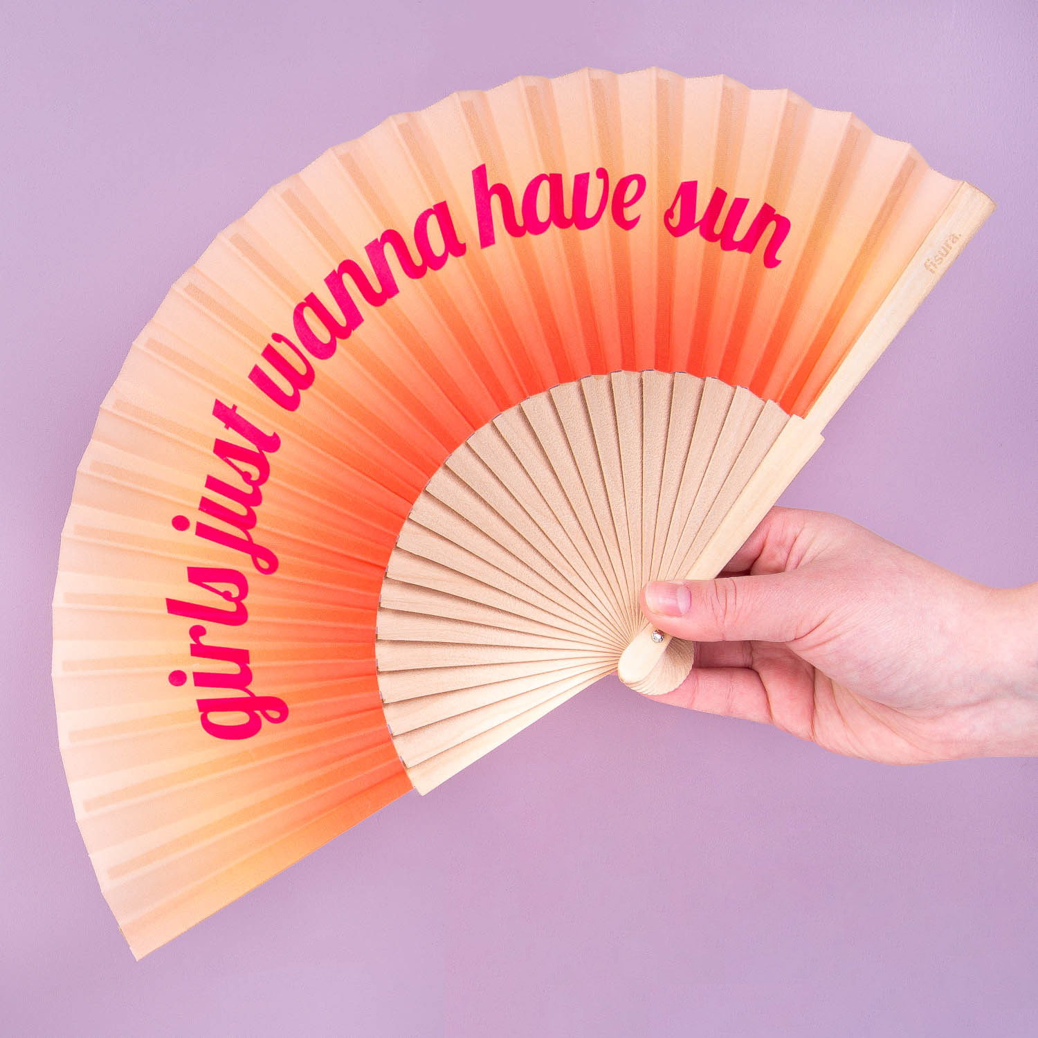 Plezier is goed, zon is beter! De Houten waaier Girls Just Wanna Have Sun van Fisura is een vrolijke oranje ombre waaier met de tekst GIRLS JUST WANNA HAVE SUN in roze letters. Perfect voor op het strand, festivals of gewoon als het weer tegenvalt en je vast wil houden aan de zomerse sfeer.