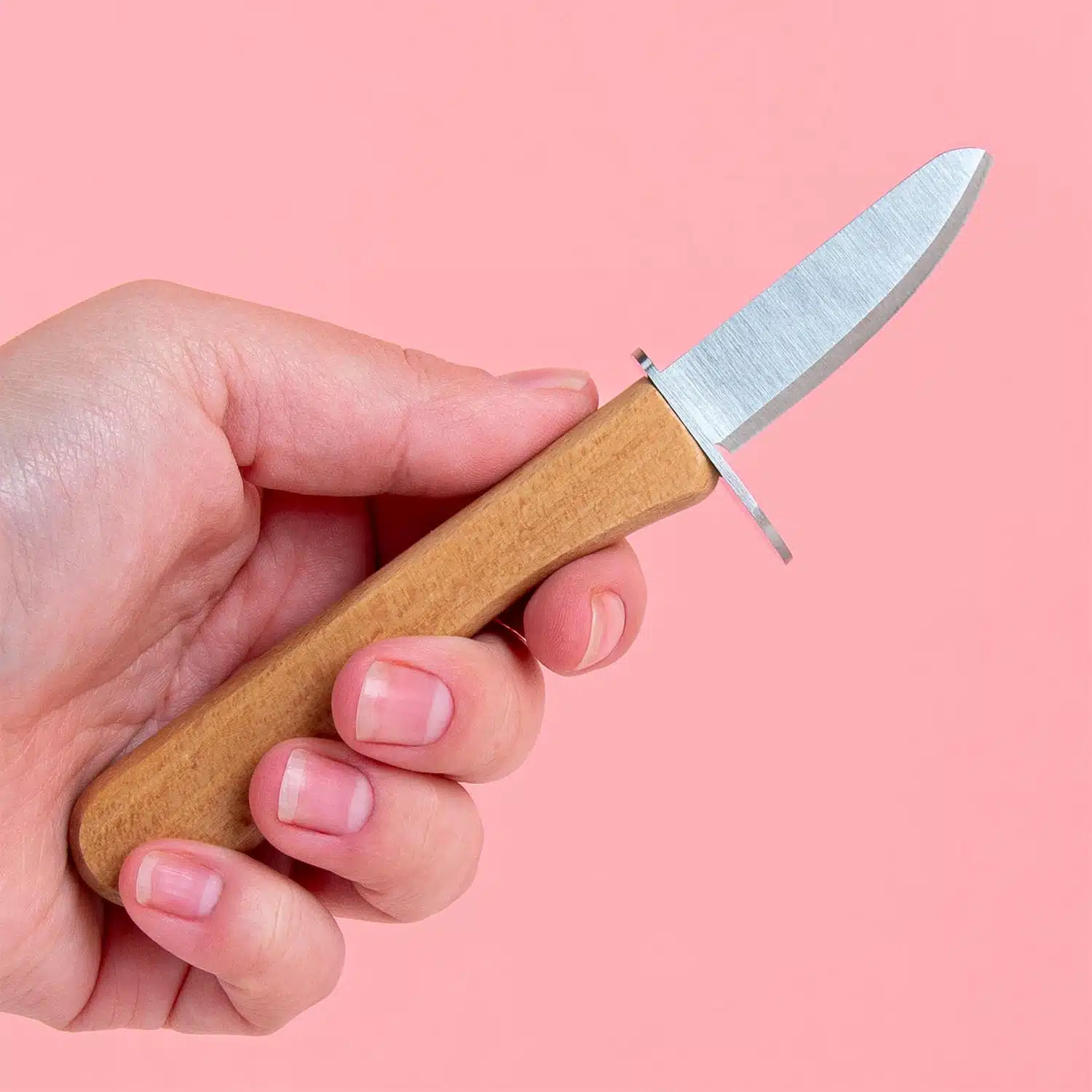 Een mes waarmee kinderen dingen van hout kunnen snijden, zoals dikke takken kunnen omtoveren tot een kunstwerkje.