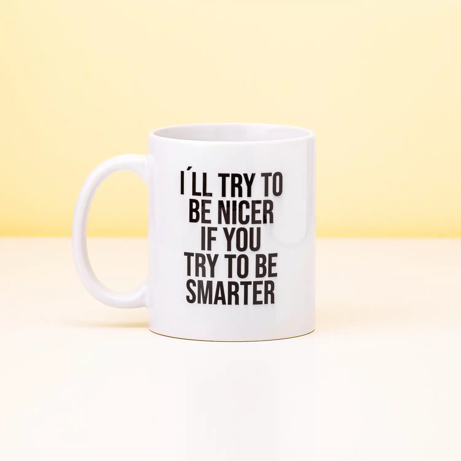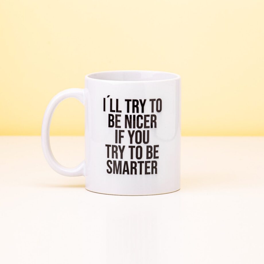 Stoor jij je vaak aan domme opmerkingen en gedraag je je dan een beetje onaardig? Misschien kun je de volgende keer wat aardiger doen. Maar dan moeten die mensen die domme opmerkingen ook beloven dat zij wat slimmer doen. Met de I’ll Try To Be Nicer If You Try To Be Smarter mok maak je deze nieuwe regeling in één keer duidelijk aan al je collega’s. We weten niet zeker of dit je ook geliefder maakt op je werk, maar daar kom je snel genoeg achter.