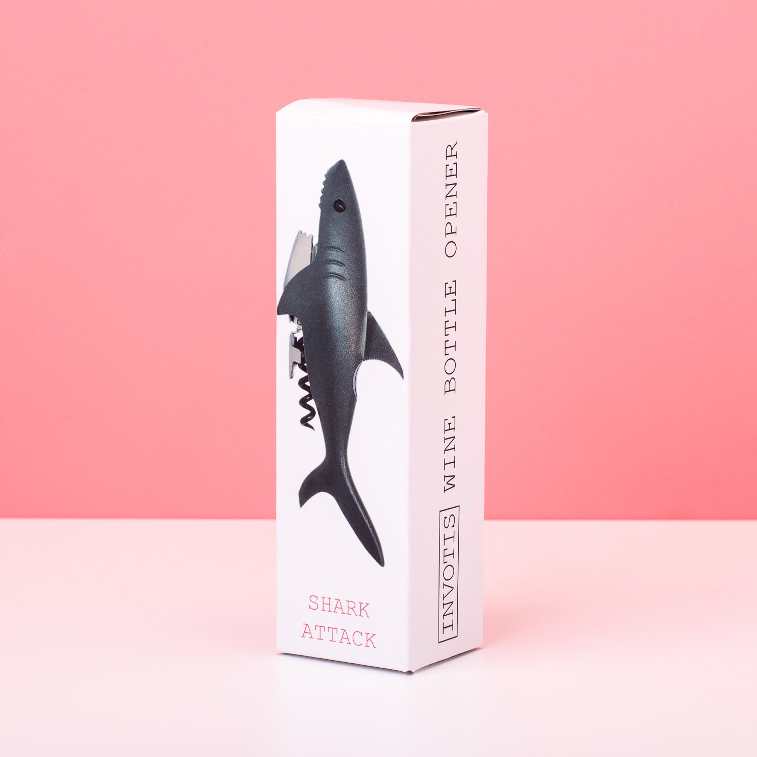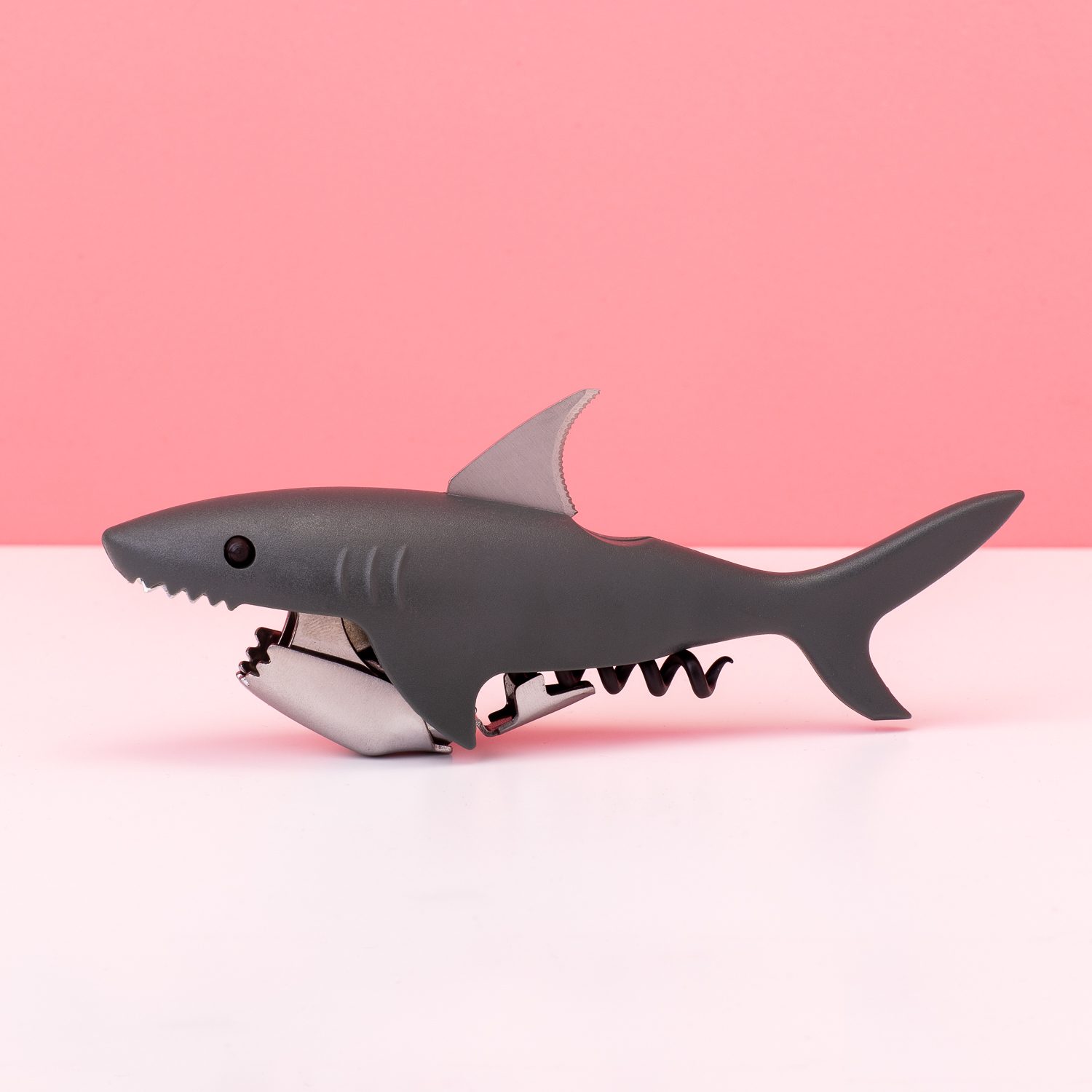 Normaal wil je waarschijnlijk liever geen haai tegenkomen, maar tegen de Haai kurkentrekker van Invotis zeg je waarschijnlijk geen nee. Helemaal niet als je wel van een wijntje op zijn tijd houdt. De haai ziet er angstaanjagend uit, maar is in werkelijkheid heel behulpzaam. Hij heeft een kurkentrekker om je wijnfles te ontkurken. Bovendien is hij voorzien van een gevaarlijke bek vol tanden, die als flesopener dienst doen. Ook in flesjes bier met kroonkurken hapt ‘ie dus graag.
