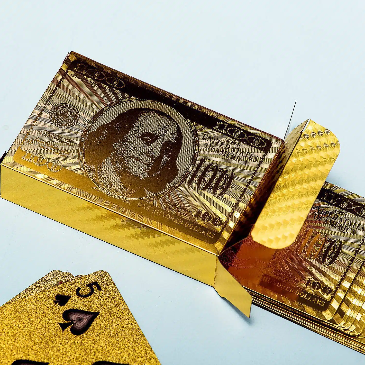 Wil je een kaartje leggen met een extra luxe gevoel? Je waant je aan de luxe speeltafels van een casino in Las Vegas met dit Gouden kaartspel van Invotis. Dit kaartspel is niet alleen goudkleurig, maar heeft ook nog eens het uiterlijk van een 100 dollar biljet. Voor als het allemaal nog niet luxe genoeg aanvoelt. Blackjack, pesten, hartenjagen: het wordt allemaal een stuk chiquer met dit goudkleurige kaartspel.