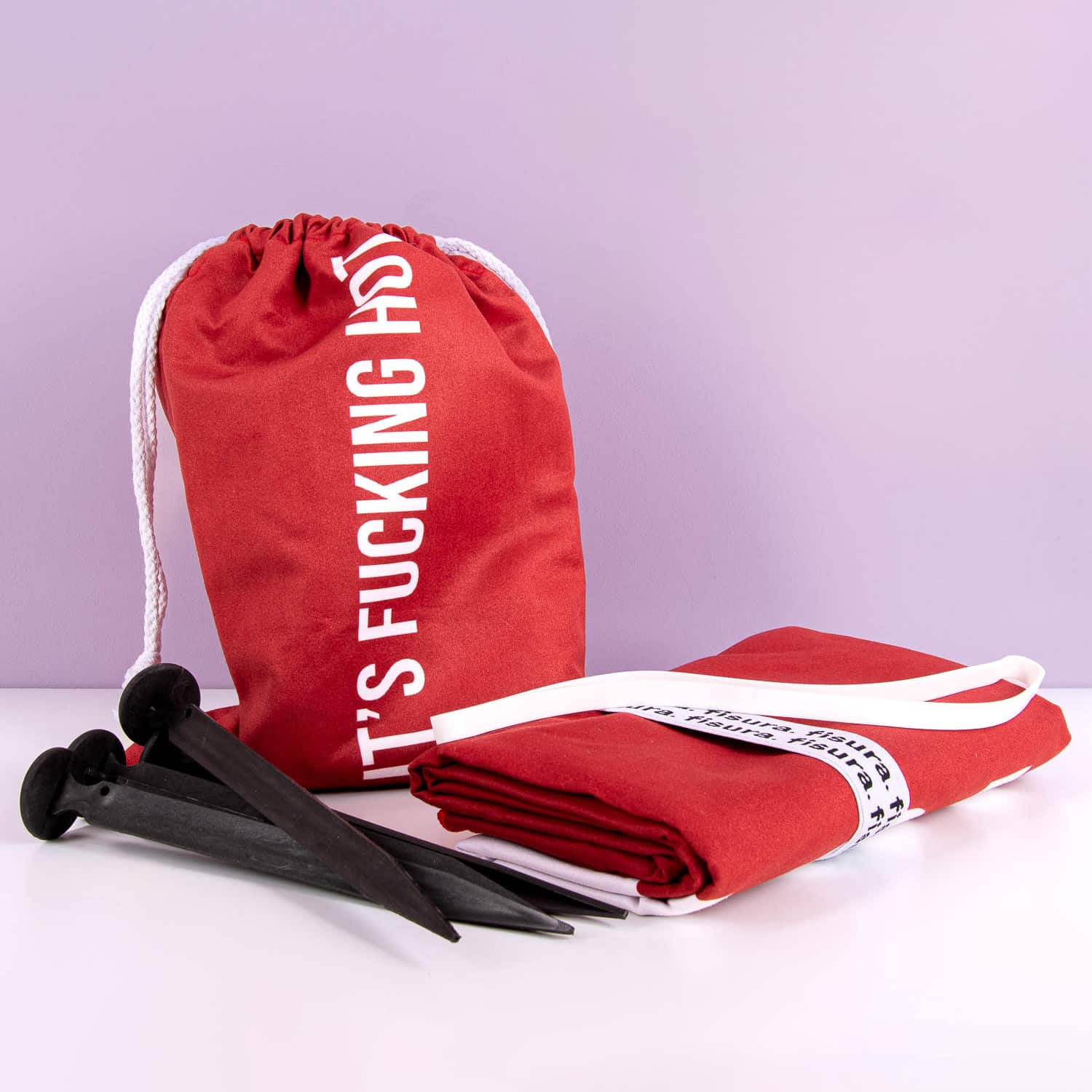 Met het It’s Fucking Hot strandlaken van Fisura maak jij een statement op het strand of aan het zwembad. Fijn dat het eindelijk zomer is, maar wat is het warm he?! De badhanddoek van sneldrogende microvezel is onmisbaar als je naar het strand gaat: hij heeft een ritszak voor je sleutels en pinpas, twee knoopjes zodat je hem als cape kunt dragen en vier haringen waarmee je hem vastmaakt in het zand of gras.