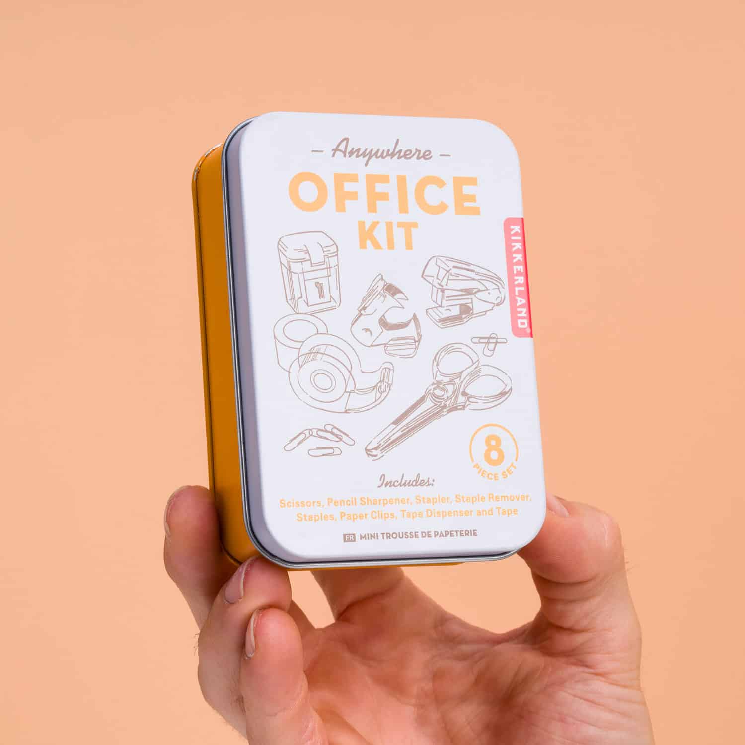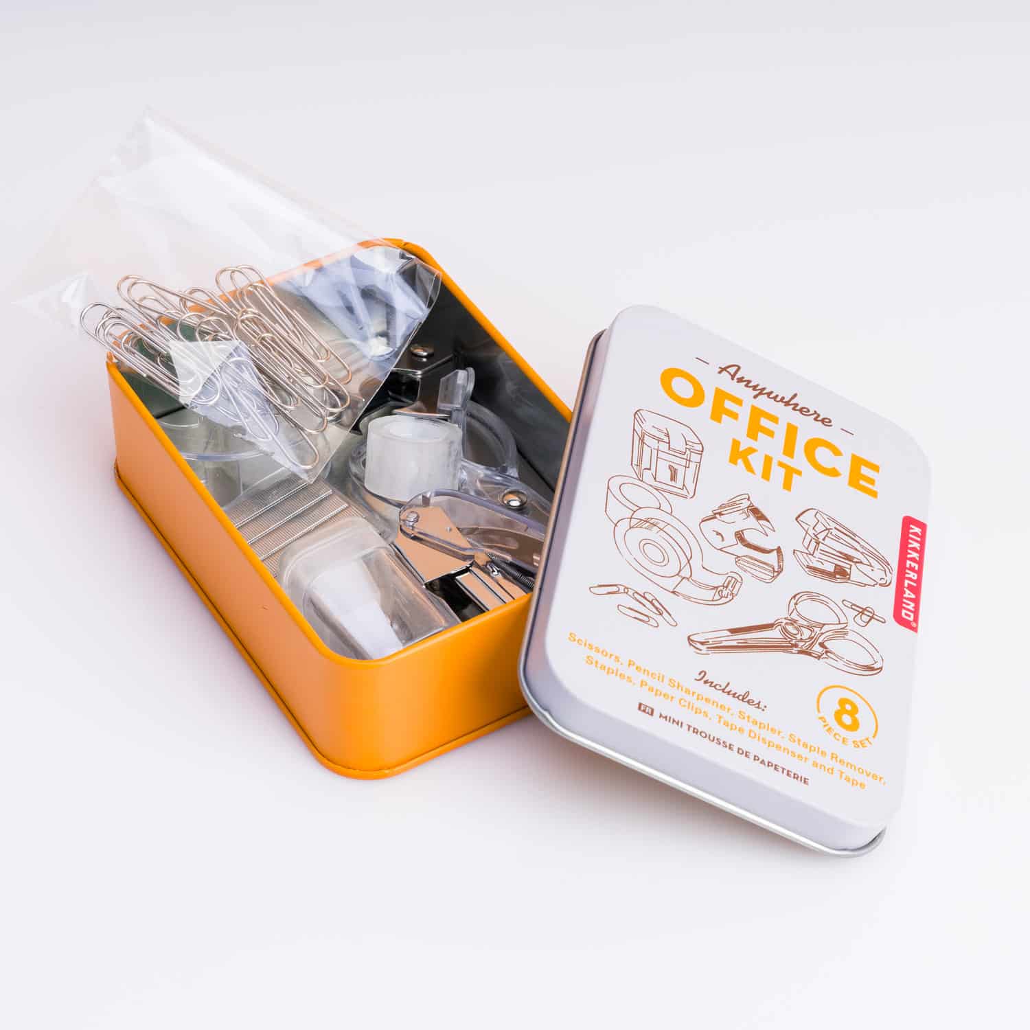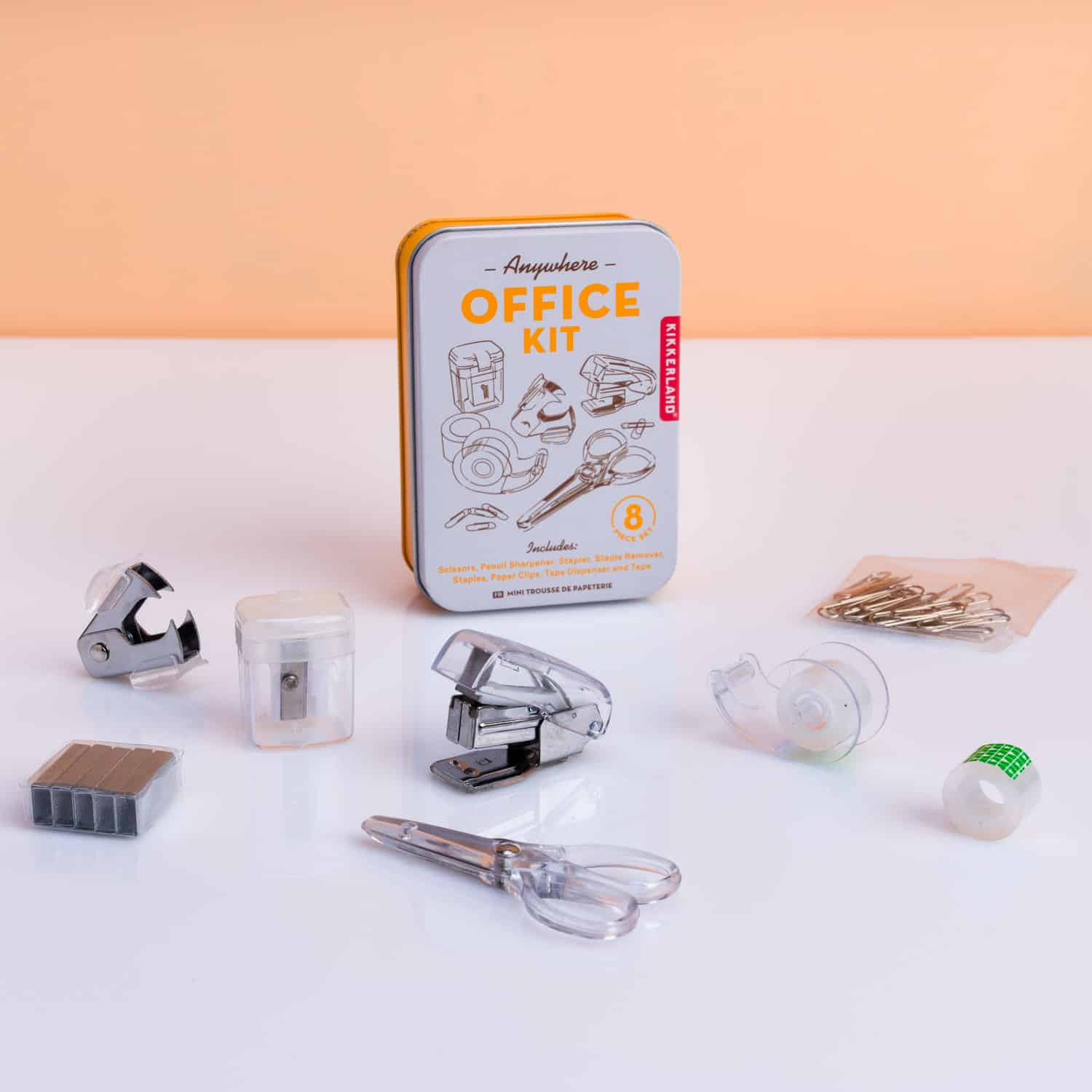 Grappig blikje met bureauaccessoires die je nodig kunt hebben als je een dag niet op kantoor werkt.