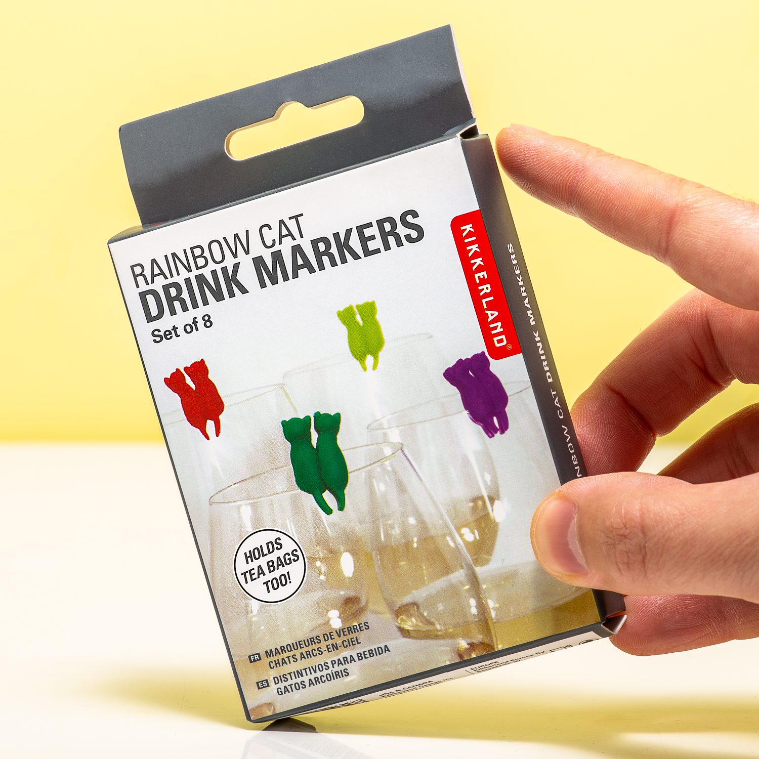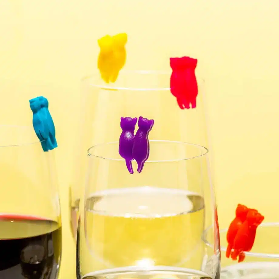 Erg prettig is het niet, om op een feestje te staan en te ontdekken dat je opeens wijn staat te drinken uit het glas van je buurvrouw. Of om er achter te komen dat jouw glas opeens weg is. Met de Kat glasmarkeerders van Kikkerland voorkom je zulk soort situaties. Je pakt een marker in de vorm van twee katten die naast elkaar zitten en klemt hem aan je glas. Op die manier hoef je alleen nog maar de kleur te onthouden, om te weten welk glas van jou is. In totaal krijg je acht verschillende kleuren glasmarkeerders.