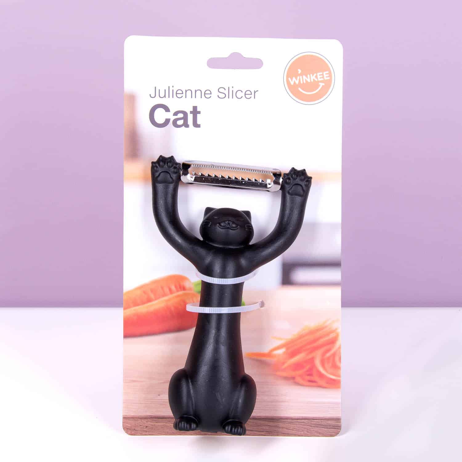 De Kat Julienne schiller van Winkee is een julienne schiller in de vorm van een kat die je groenten transformeert in perfecte dunne reepjes. Perfect voor courgettespaghetti, wortelsliertjes of komkommersalade. Deze kattige keukenhulp ligt lekker in de hand en maakt van elke groente een kunstwerkje. Ideaal cadeau voor kattenliefhebbers die ook van koken houden, of voor iedereen die zijn groentegame wil upgraden. Want waarom zou je met een saaie schiller werken als het ook met een kat kan?