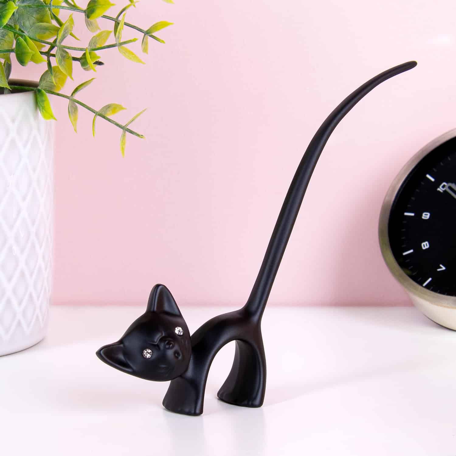 De Kat ringhouder van Invotis is een ideaal cadeau voor iedereen die haar ringen graag overzichtelijk opbergt. Deze zwarte kat brengt geen ongeluk, maar geluk: je hoeft nooit meer te zoeken naar je favoriete ringen. De lange staart van de kat is speciaal ontworpen om al je ringen voor je te bewaren. En hij staat nog leuk op je nachtkastje ook.