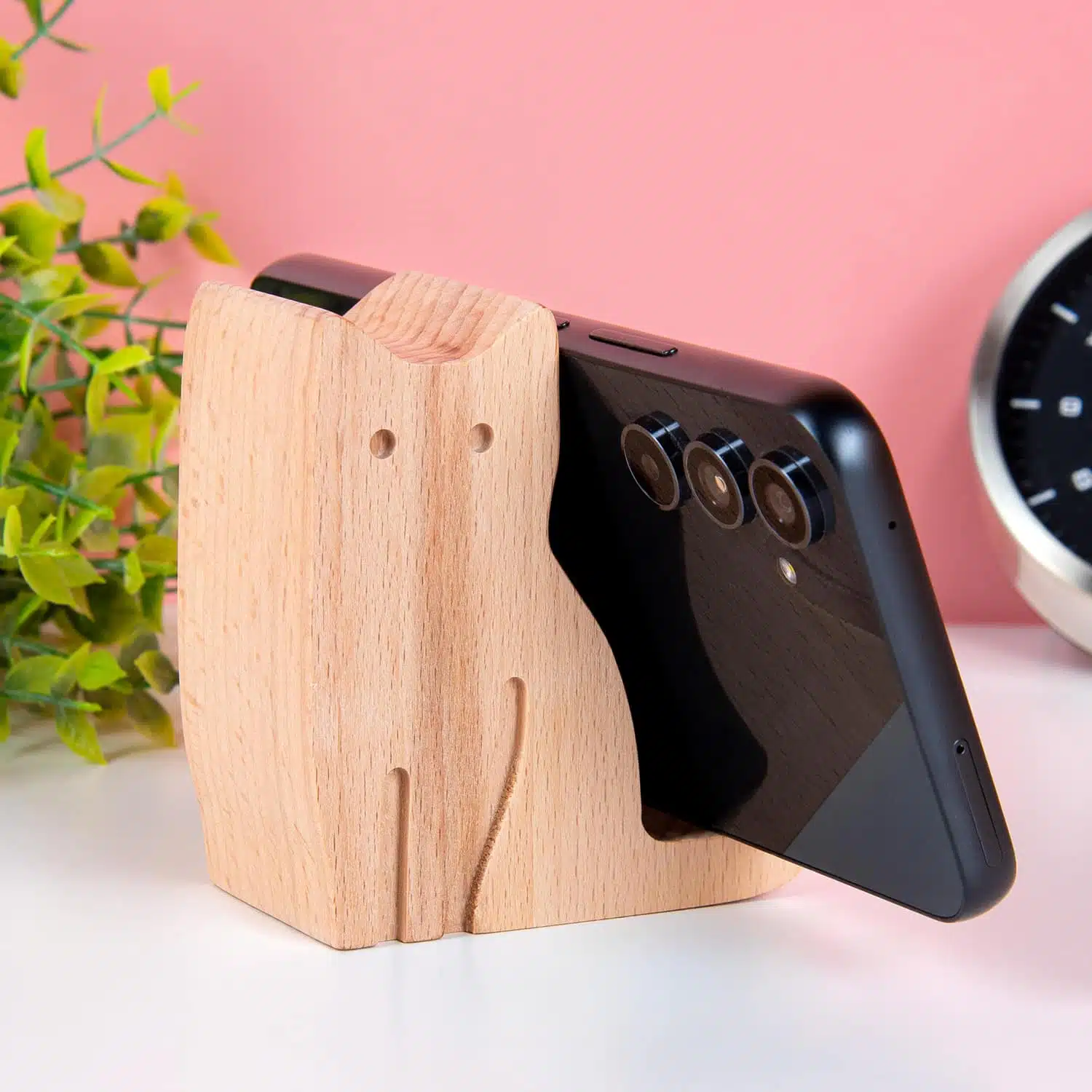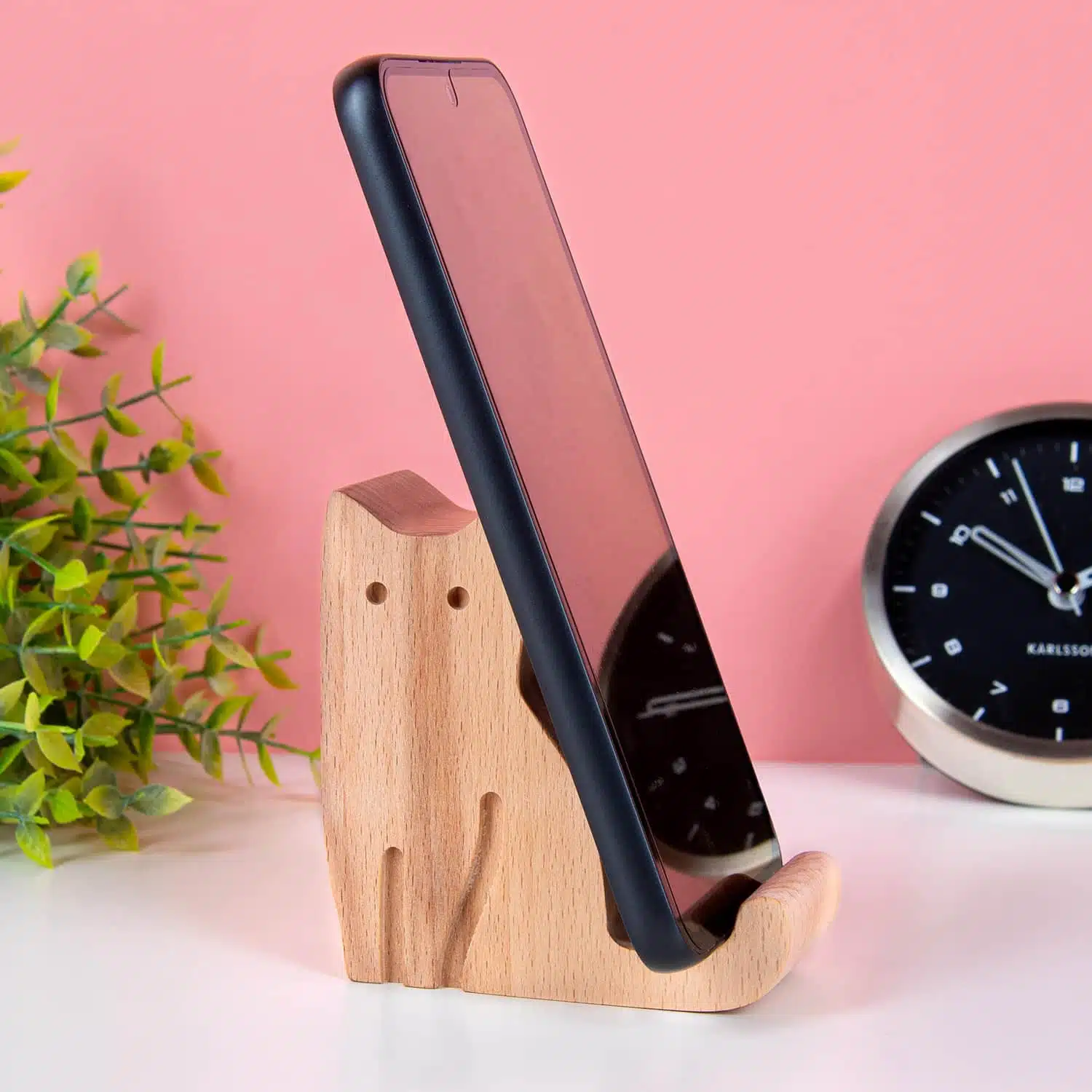 Of je nu houdt van een opgeruimd bureau of veel video’s opneemt waarbij je zelf in beeld bent: de Kat telefoonhouder van Kikkerland helpt je graag. Deze telefoonhouder van hout houdt jouw telefoon vast, zodat je handsfree kunt bellen en filmen. Maar dat is niet het enige: door zijn schattige uiterlijk is hij sowieso een aanwinst op je bureau. De staart van de kat voorkomt dat je telefoon wegglijdt.