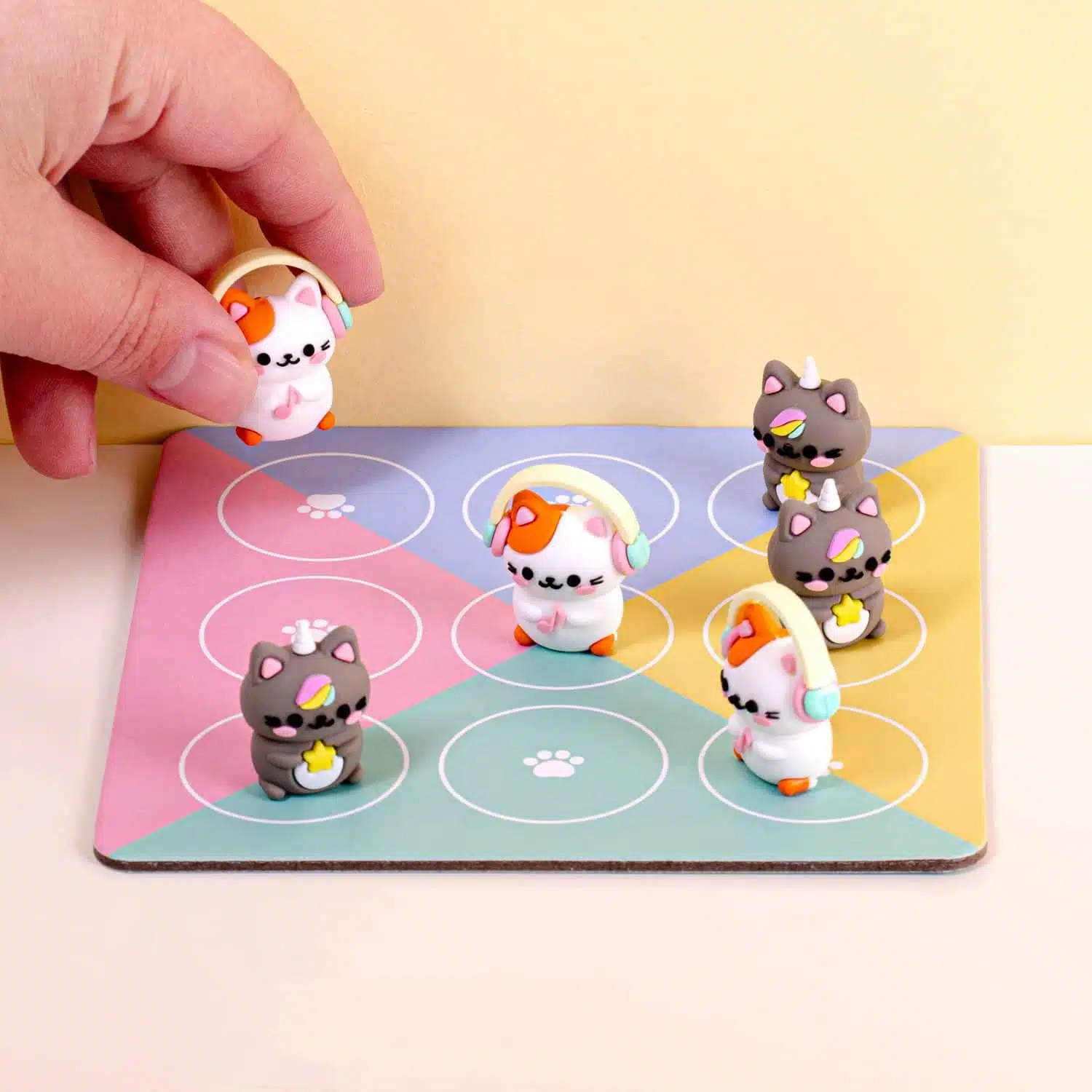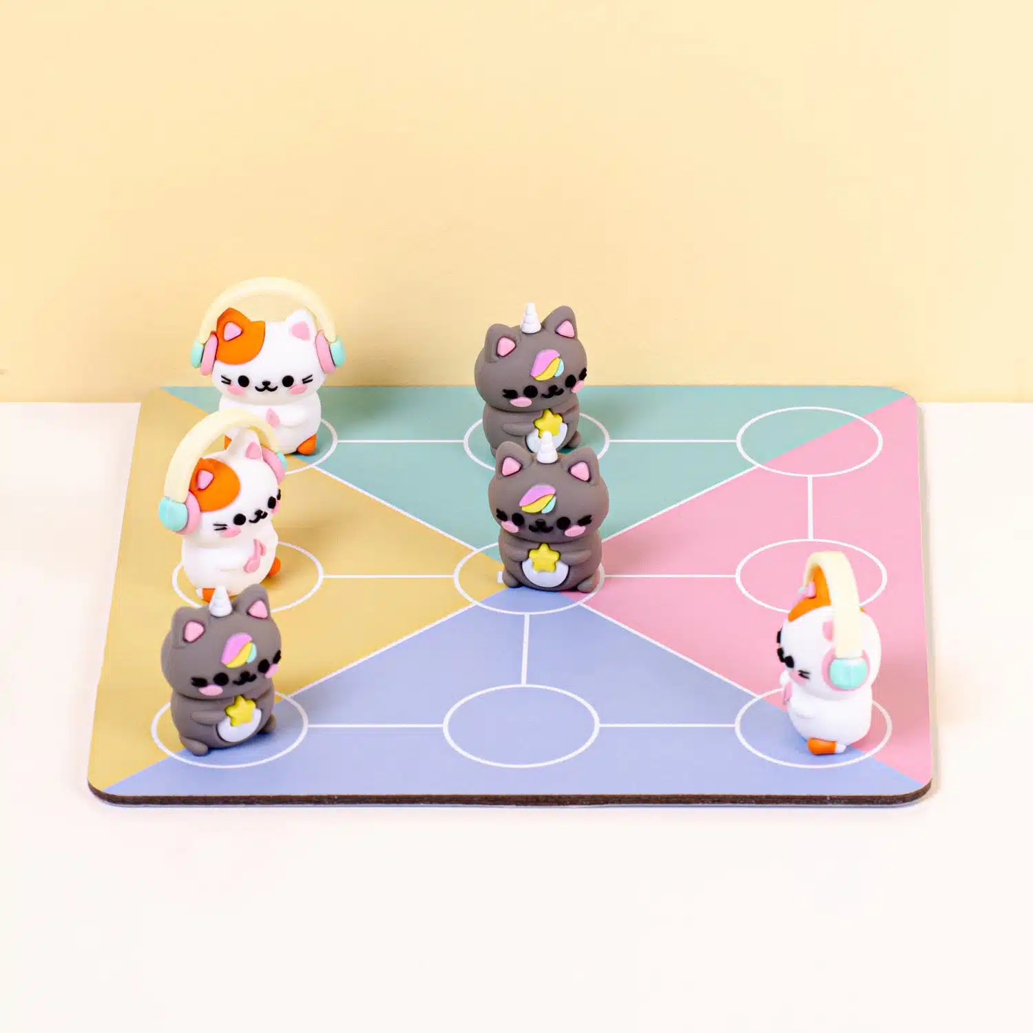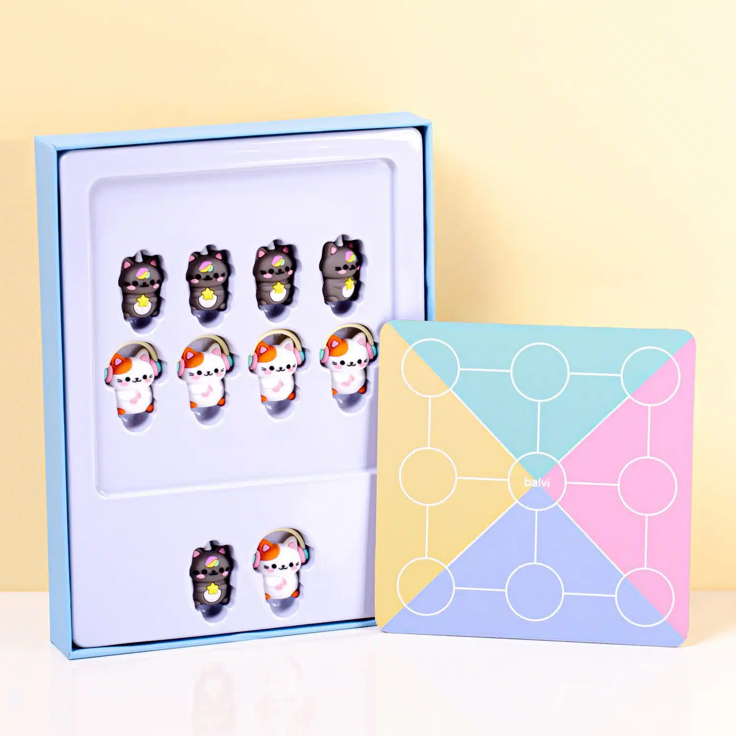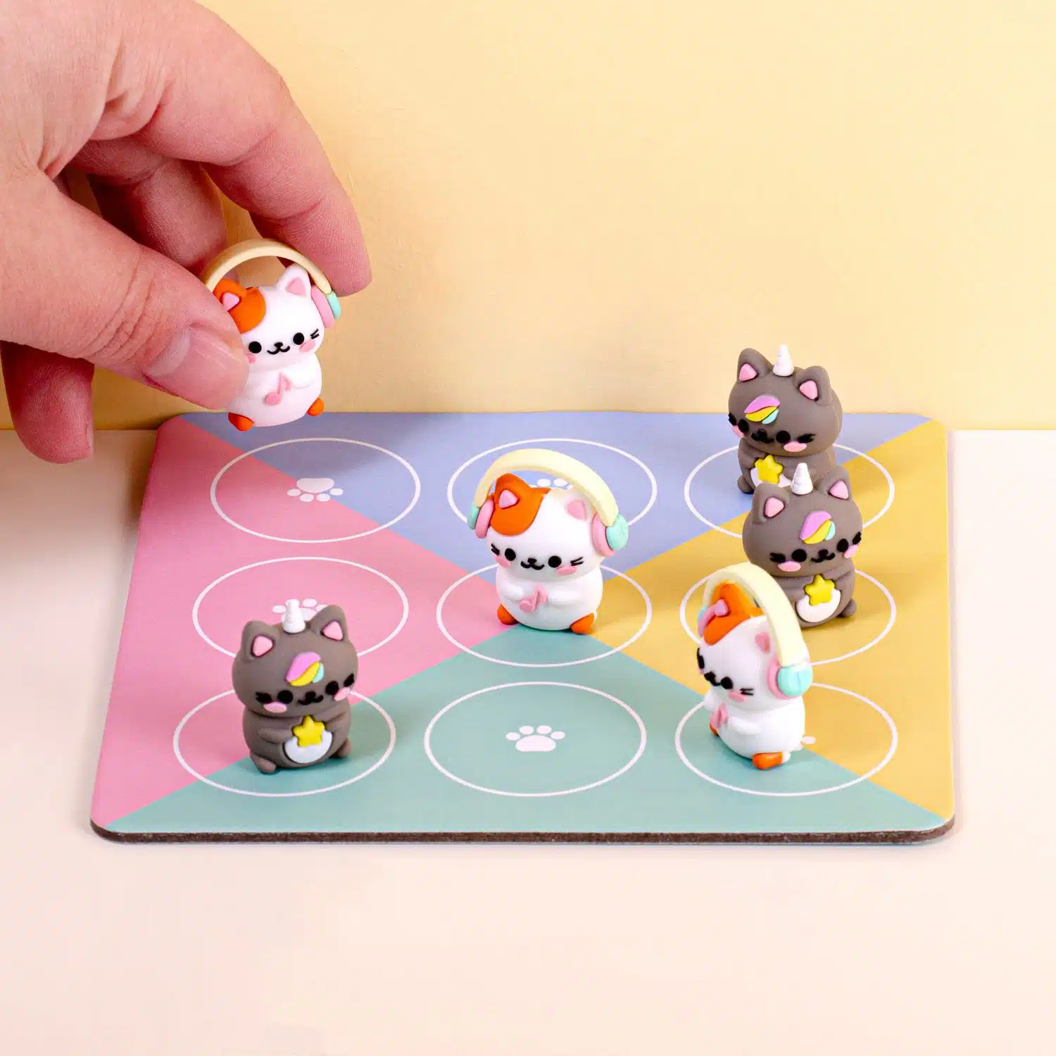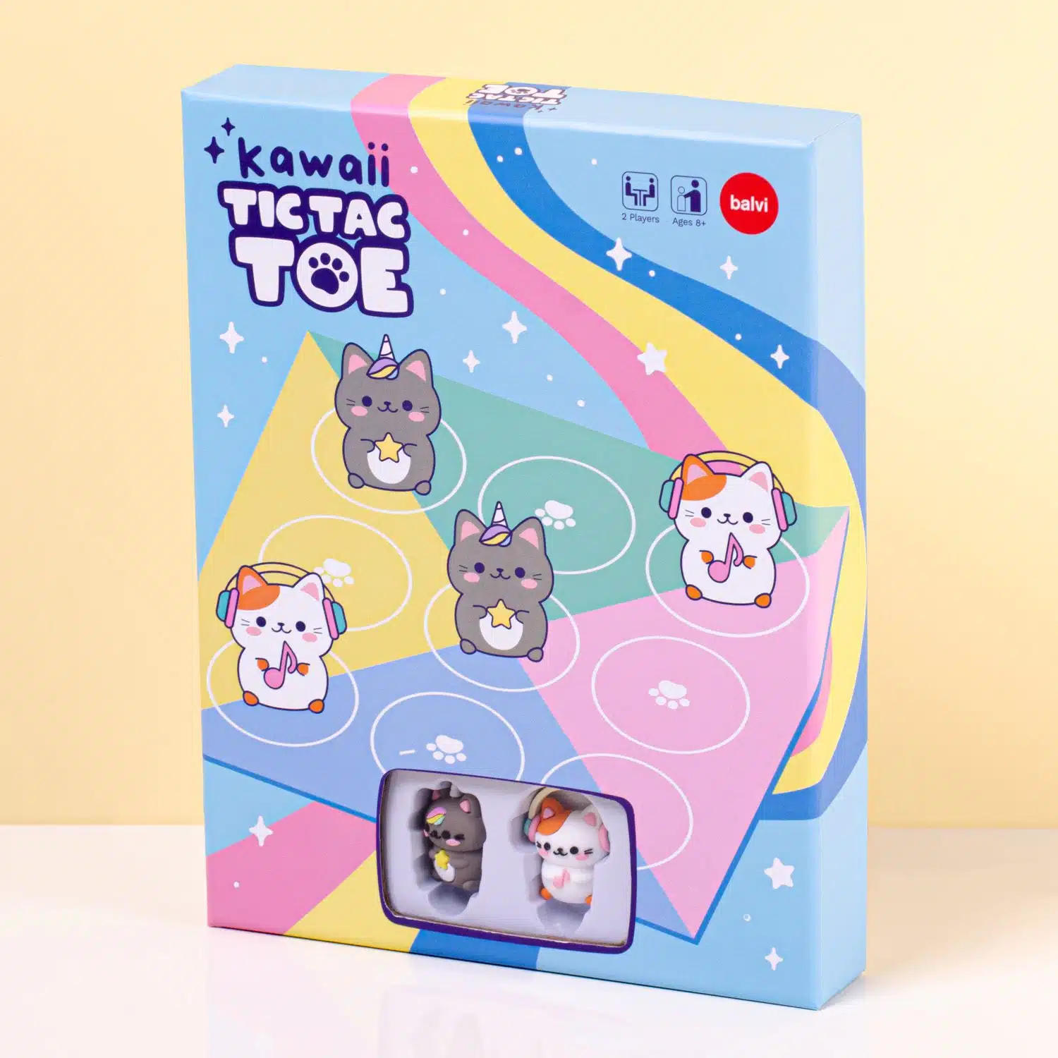 Tic tac toe of boter-kaas-en-eieren is een leuk en simpel spelletje om te spelen met een kind. Met het Kawaii Tic Tac Toe spelletje van Balvi wordt het nog veel leuker. Dit spel is helemaal in Japanse kawaii stijl: van het snoepige speelbord tot de spelfiguurtjes. Je speelt namelijk met een kat met een koptelefoon op en met een kat met een eenhoorn hoorn. Het doel is natuurlijk om drie figuurtjes op een rij te krijgen. Leuk compact spelletje dat je makkelijk mee kunt nemen.