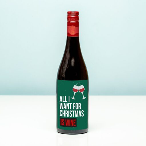 Wijnfles met tekst All I Want For Christmas Is Wine