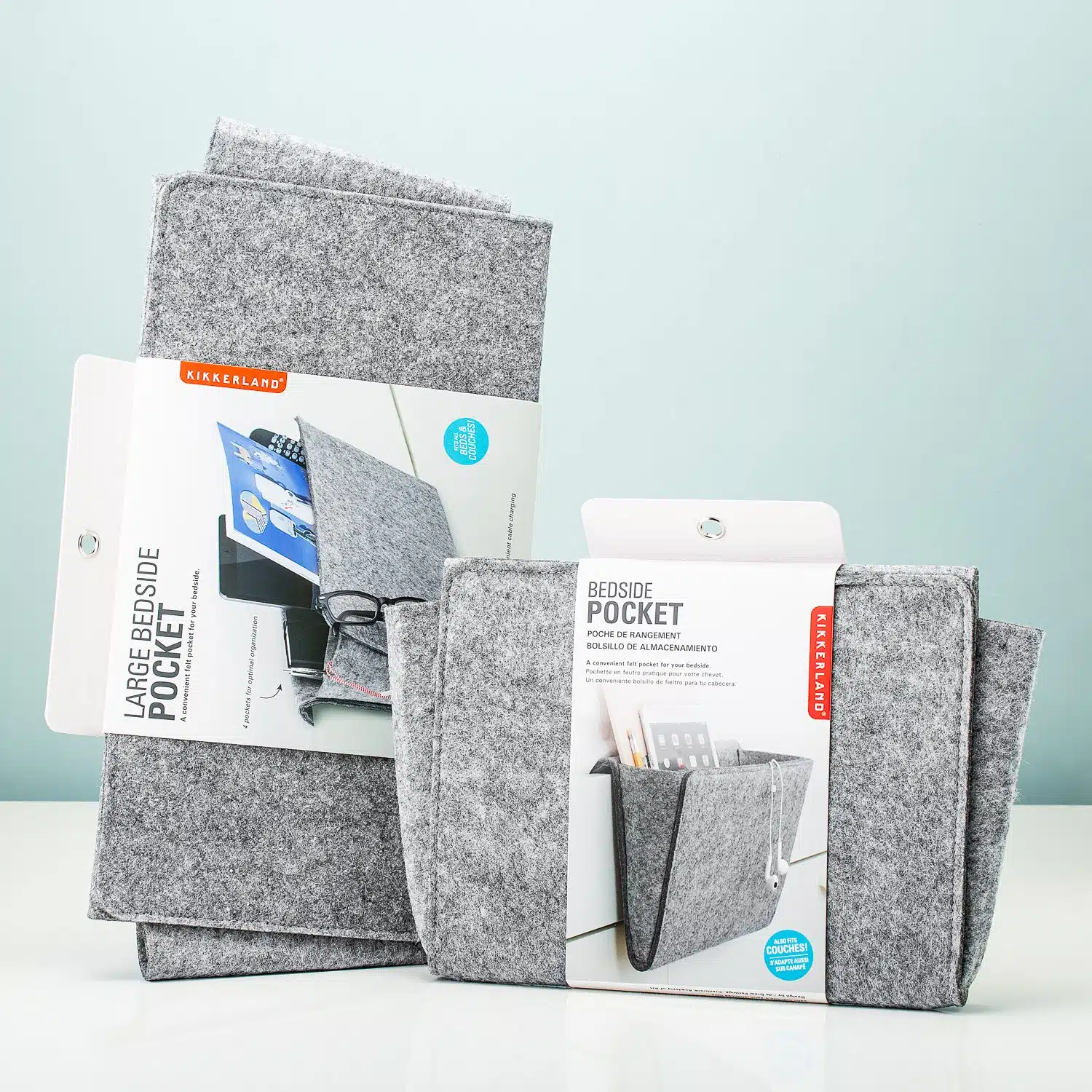 Slaap je in een kleine kamer waar geen nachtkastje in past? Gebruik dan de Bedside pocket van Kikkerland. Dit is een soort nachtkastje dat je aan je bed kunt hangen. Je kunt er van alles instoppen, zoals je telefoon, e-reader en bril. Door de neutrale grijze kleur past deze handige zak voor aan je bed in elk interieur. En omdat hij is gemaakt van zacht vilt beschadigt hij je scherm of bril niet. De zak is een perfecte oplossing voor iemand die graag een opgeruimd huis heeft, maar weinig ruimte heeft voor kasten. Ideaal voor studentenkamers!