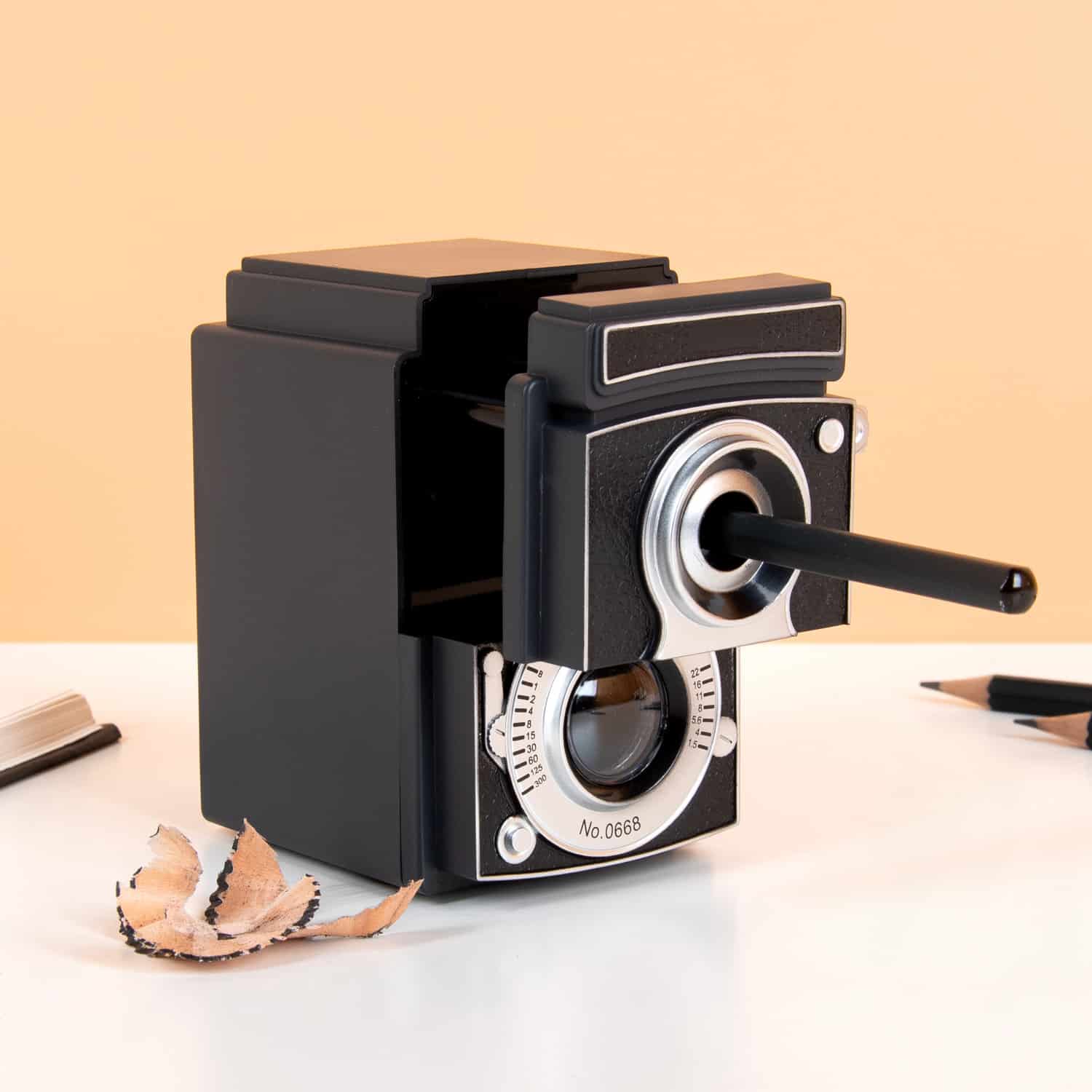 • Ouderwetse puntenslijper in de vorm van een vintage camera