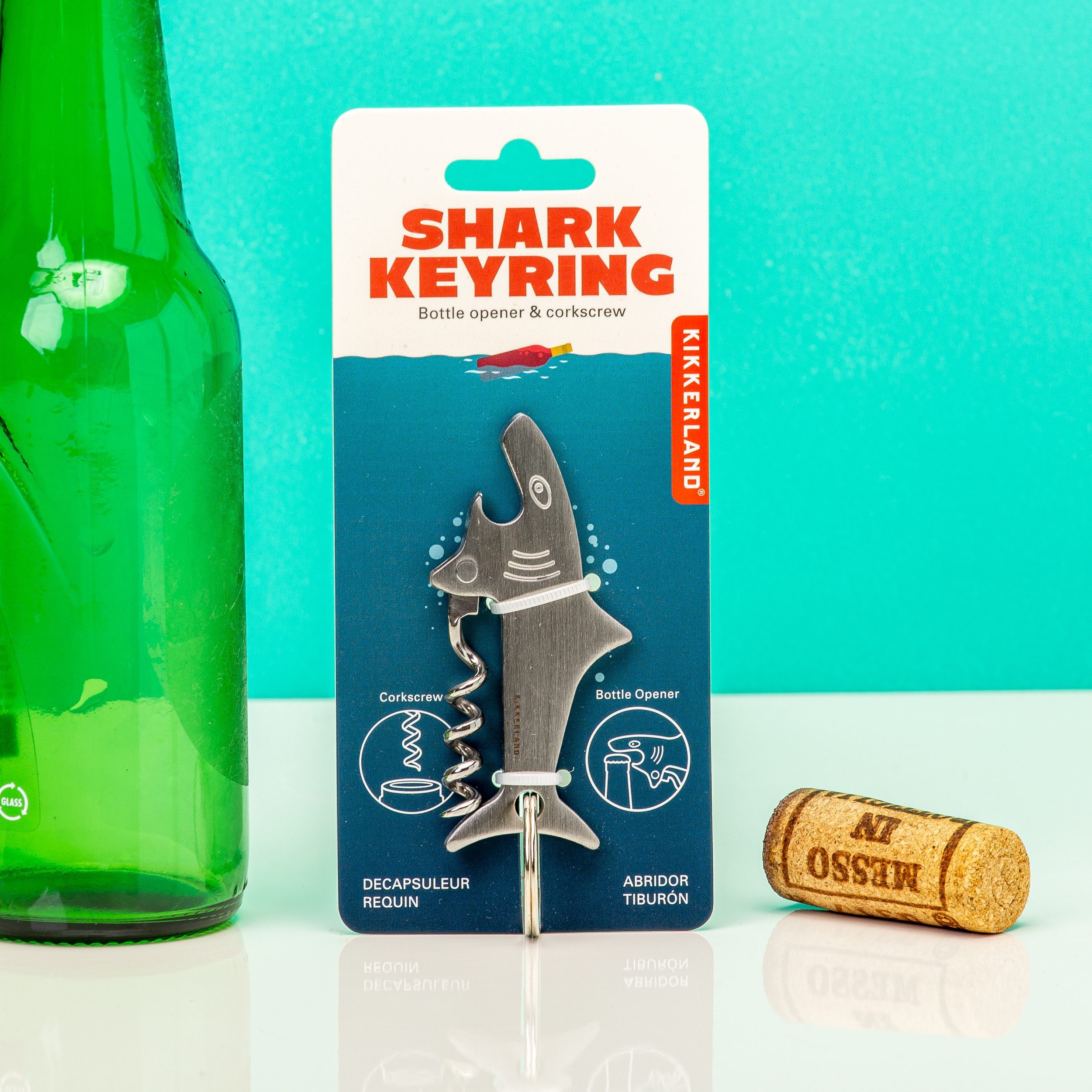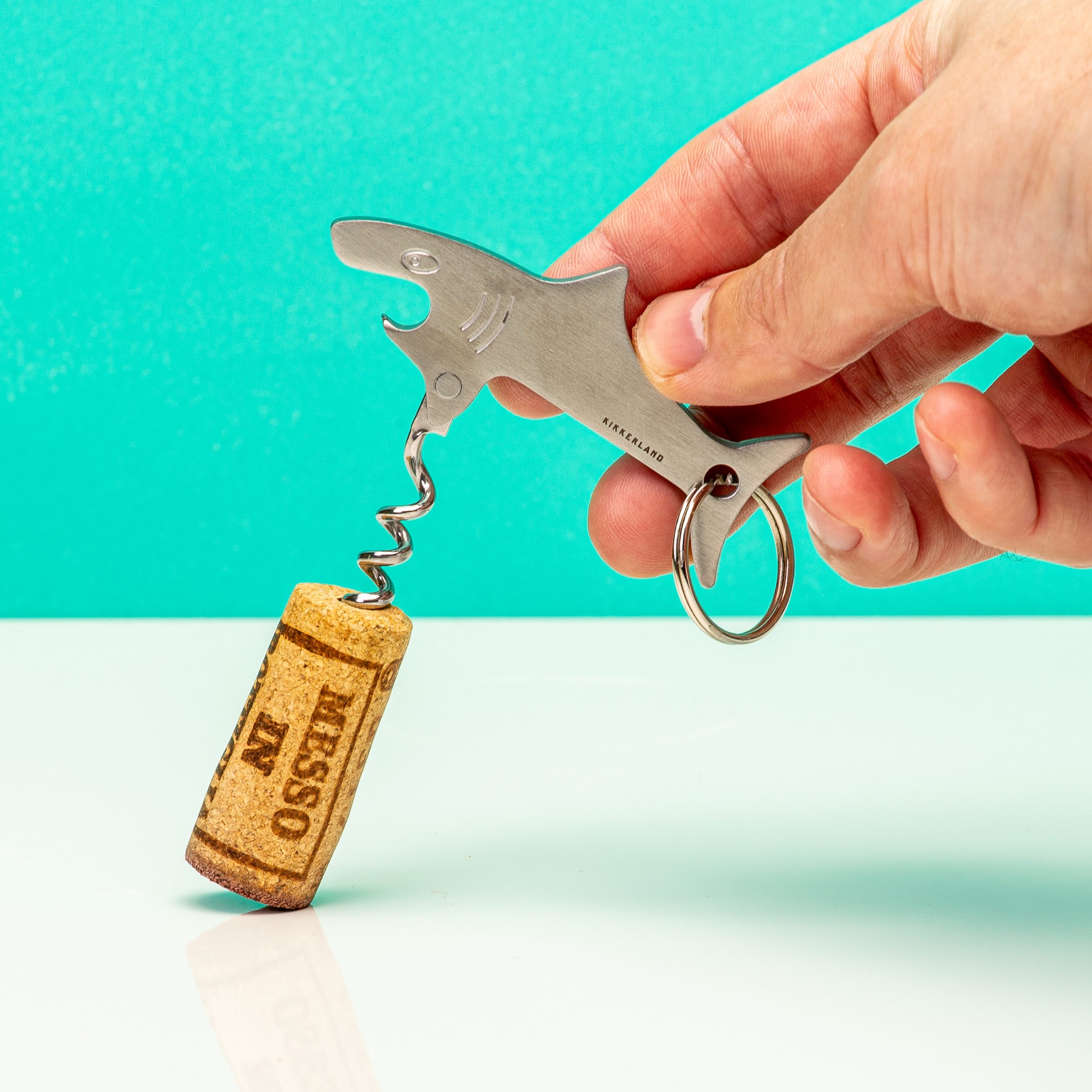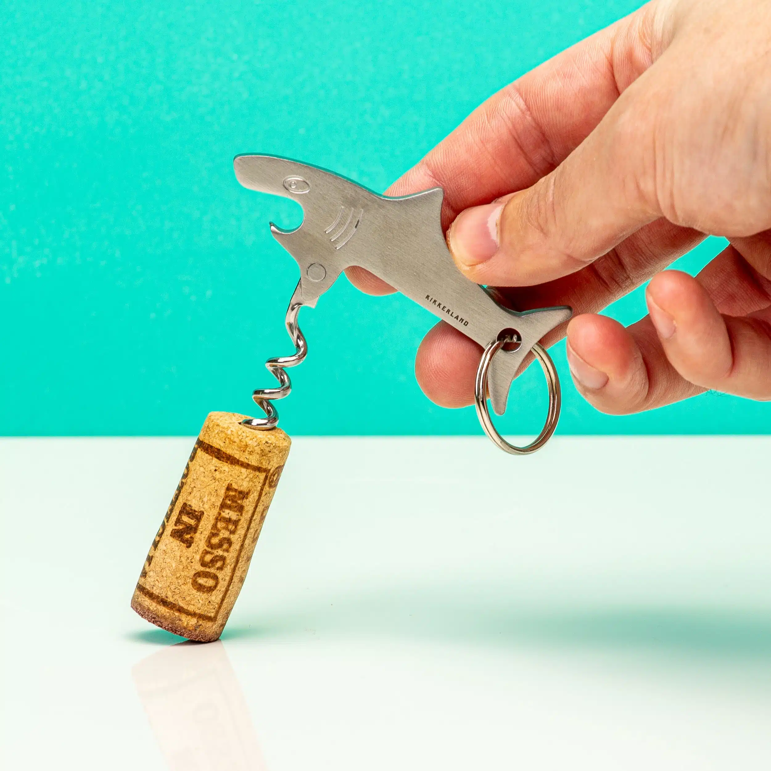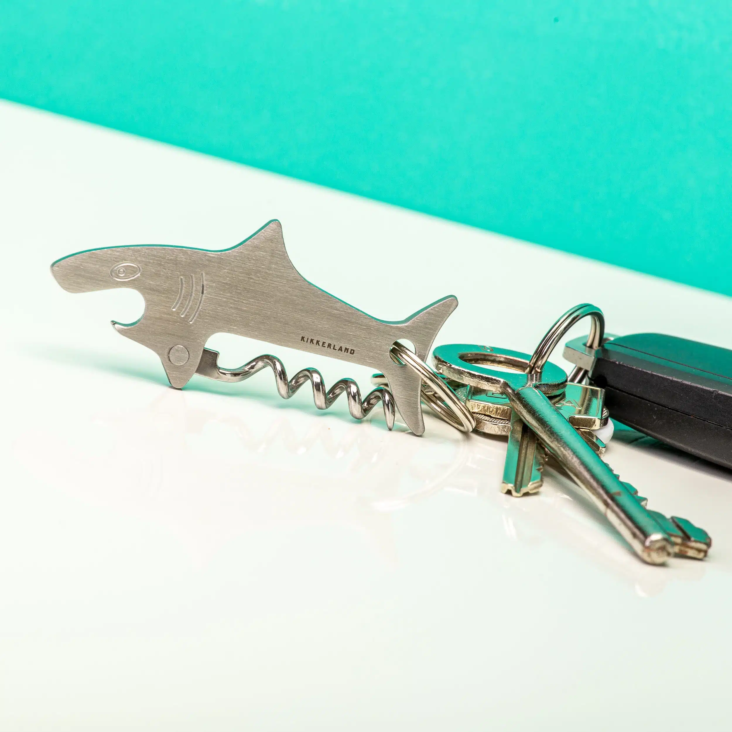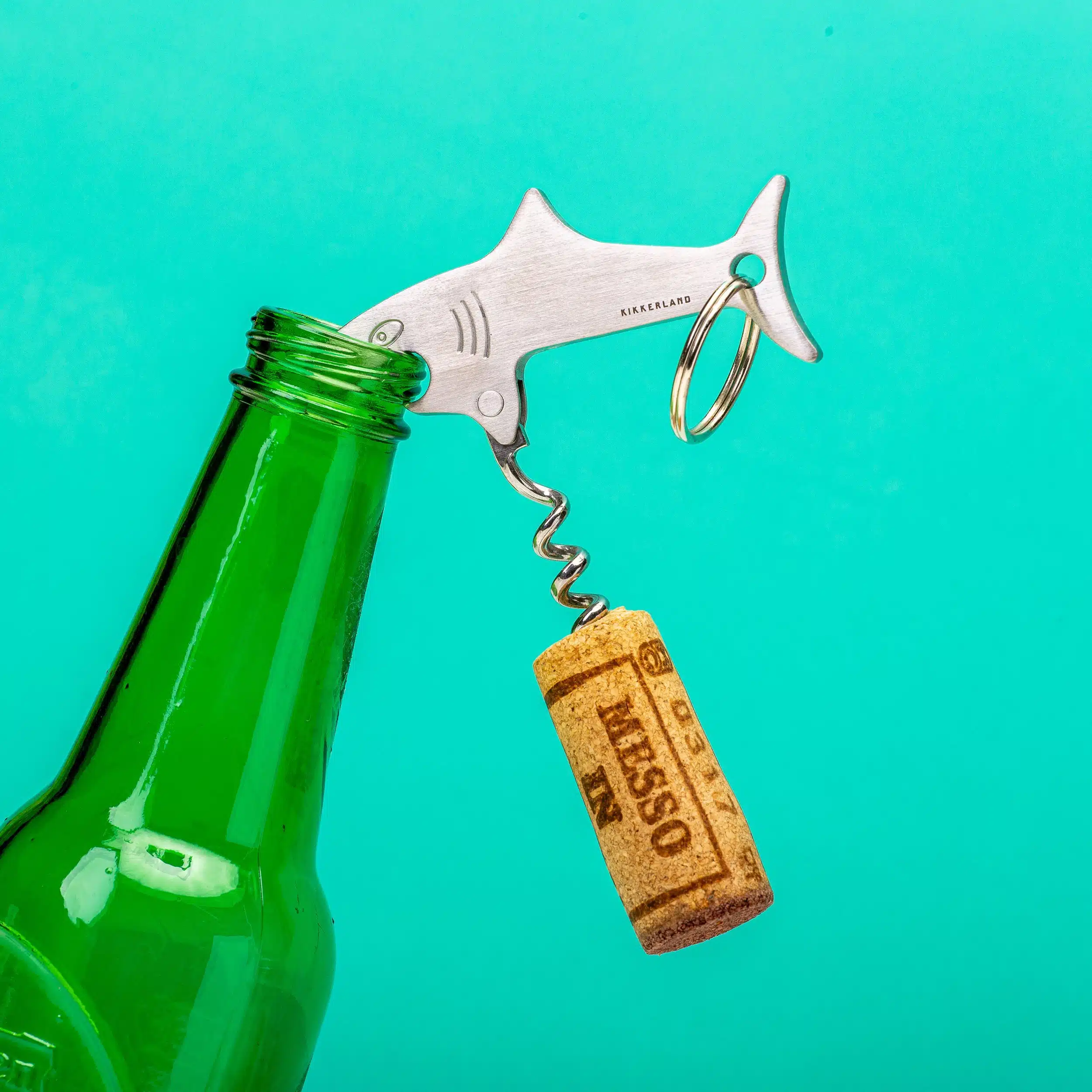 Een onverwachts feestje in het park? Jij hebt gelukkig altijd je Haai bartool van Kikkerland bij je. Deze haai is voorzien van een kurkentrekker om een fles wijn te openen. En met zijn bek bijt hij met gemak een flesje bier open. Of andere kroondoppen, zoals die van een flesje cola of water natuurlijk. De flesopener en kurkentrekker in één heeft een handige ring, waar je je sleutels aan kunt hangen. Mocht je dus opeens besluiten om een fles wijn te kopen in de supermarkt en deze open te maken in het park met vrienden, dan ben jij goed voorbereid.