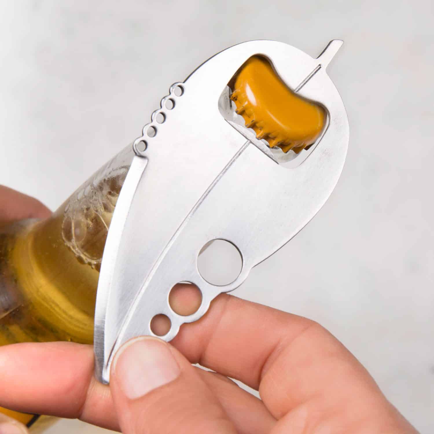 Stel, je maakt een lekkere stoof- of ovenschotel. Dan is het belangrijk om het gerecht goed te kruiden. De Kruiden multitool van Kikkerland helpt je daarmee. Deze handige multitool in de vorm van een blad kan openen, pellen, snijden en zesten. Heb je wat citroenschil nodig? Gebruik dan de vijf scherpe gaatjes om de schil te zesten. Tijm en rozemarijn haal je eenvoudig van de tak met één van de vier gaatjes aan de andere kant van de blad multitool. Natuurlijk kun je met het mesje eenvoudig snijden en vruchten pellen. Tot slot heeft de roestvrij stalen multitool een flesopener, want bier is heerlijk in een stoofschotel. Of giet het gewoon rechtstreeks in je mond, dat kan ook.