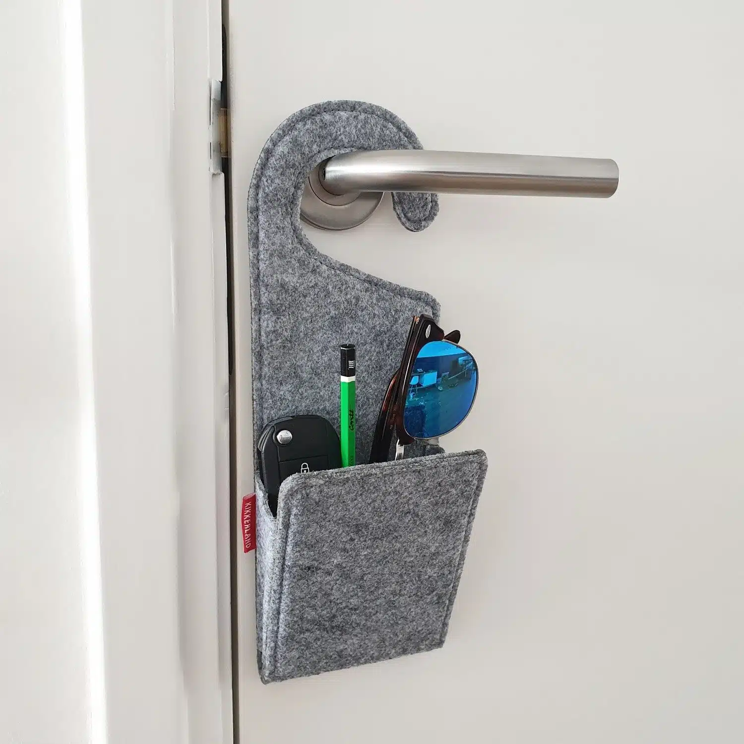 Als je nogal een sloddervos bent, dan komt het vast regelmatig voor dat je je sleutels zoekt. En terwijl je door het huis rent, bedenk je je voor de zoveelste keer dat je echt een vaste plek voor je sleutelbos moet gaan zoeken. Met de Deurklink zak van Kikkerland heb je die vaste plek gevonden! Deze handige zak van vilt hang je aan de deurklink. Hij is groot genoeg voor je sleutelbos, de oplader van je telefoon en je bril. Woon je klein en kan je alle ruimte goed gebruiken? Ook dan is deze deurklink zak ideaal! Hij is gemaakt van grijs vilt en past dus in elk interieur.
