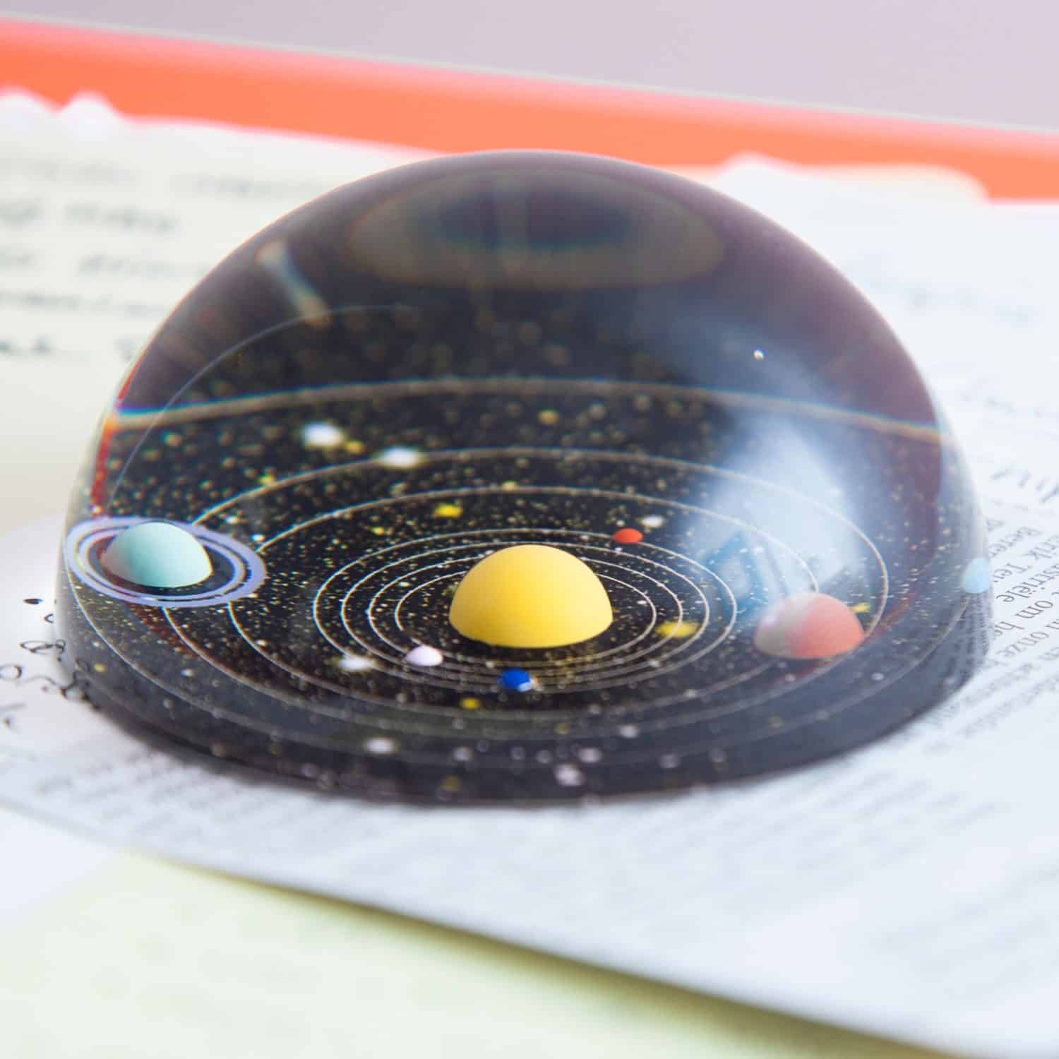 Een presse wat? We geven het toe: een presse papier is niet het hipste van het hipste. Maar vergis je niet, want de Planetarium presse papier van Kikkerland is wel verrekte handig. Deze paperweight doet precies wat z’n naam zegt: hij zorgt ervoor dat papier niet weg kan waaien. En door het 3D sterrenstelsel aan de binnenkant doet ‘ie dat op een zeer stijlvolle manier. Je ziet onder andere de zon, maan, Venus, Mars en Jupiter. Gebruik de Planetarium presse papier tijdens het studeren, om bonnetjes bij elkaar te bewaren of geef hem cadeau aan iemand die dol is op ruimtevaart. Je krijgt deze 3D paper weight in een cadeauverpakking. Hij is 4 x 8 centimeter groot.