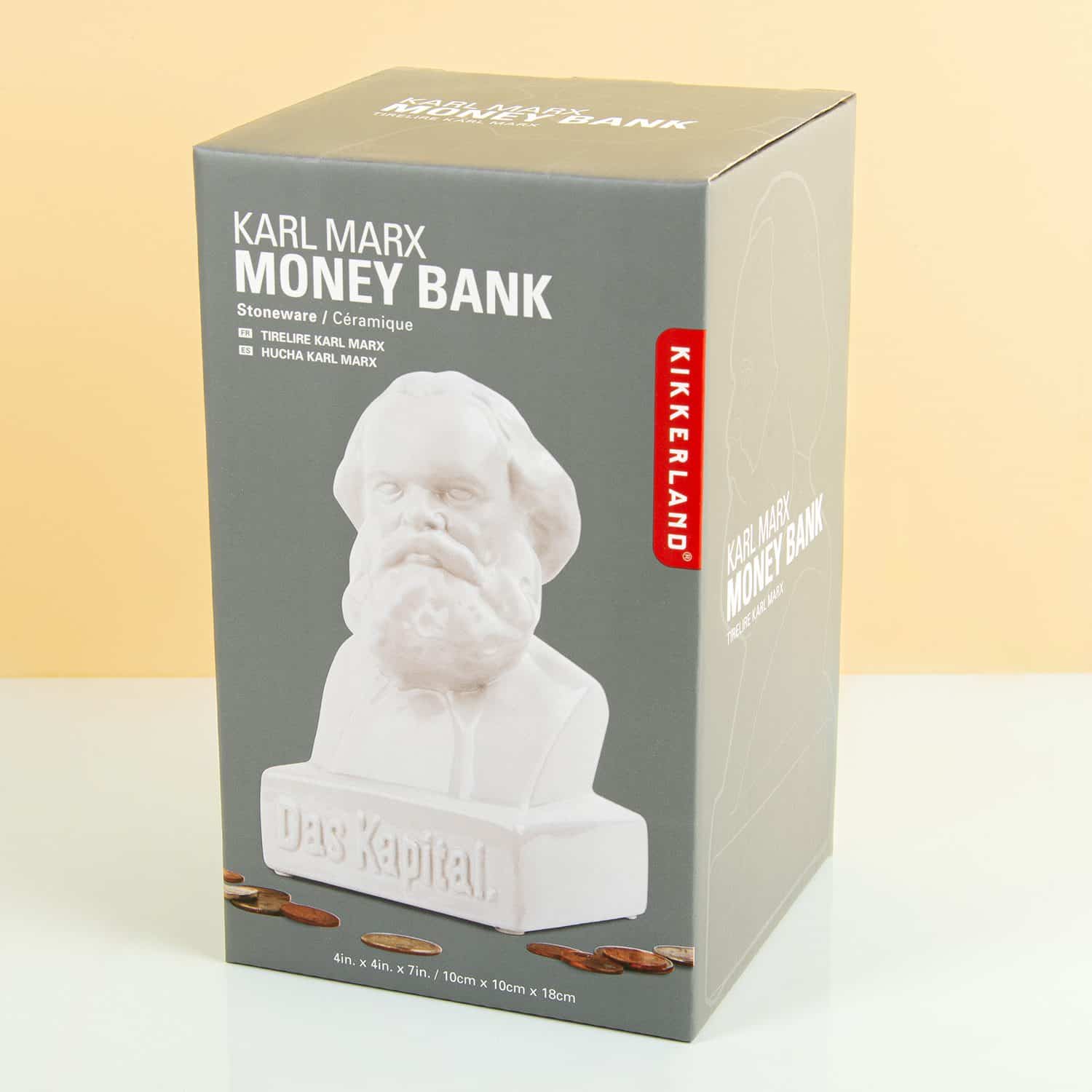 Heb je een gat in je hand? Pak het slimmer aan en stop je geld in de Karl Marx spaarpot van Kikkerland. Spaar voor een leuk zakcentje samen met de man die gelijkheid onder burgers promootte. Op de spaarpot staat de naam van zijn boek: Das Kapital. We beloven je: sparen met Karl Marx is veel leuker dan met een spaarrekening bij de bank. Aan de bovenkant van het standbeeld zit een gleuf om de muntjes erin te gooien en aan de onderkant zit een rubberen deksel om het geld er weer uit te halen.