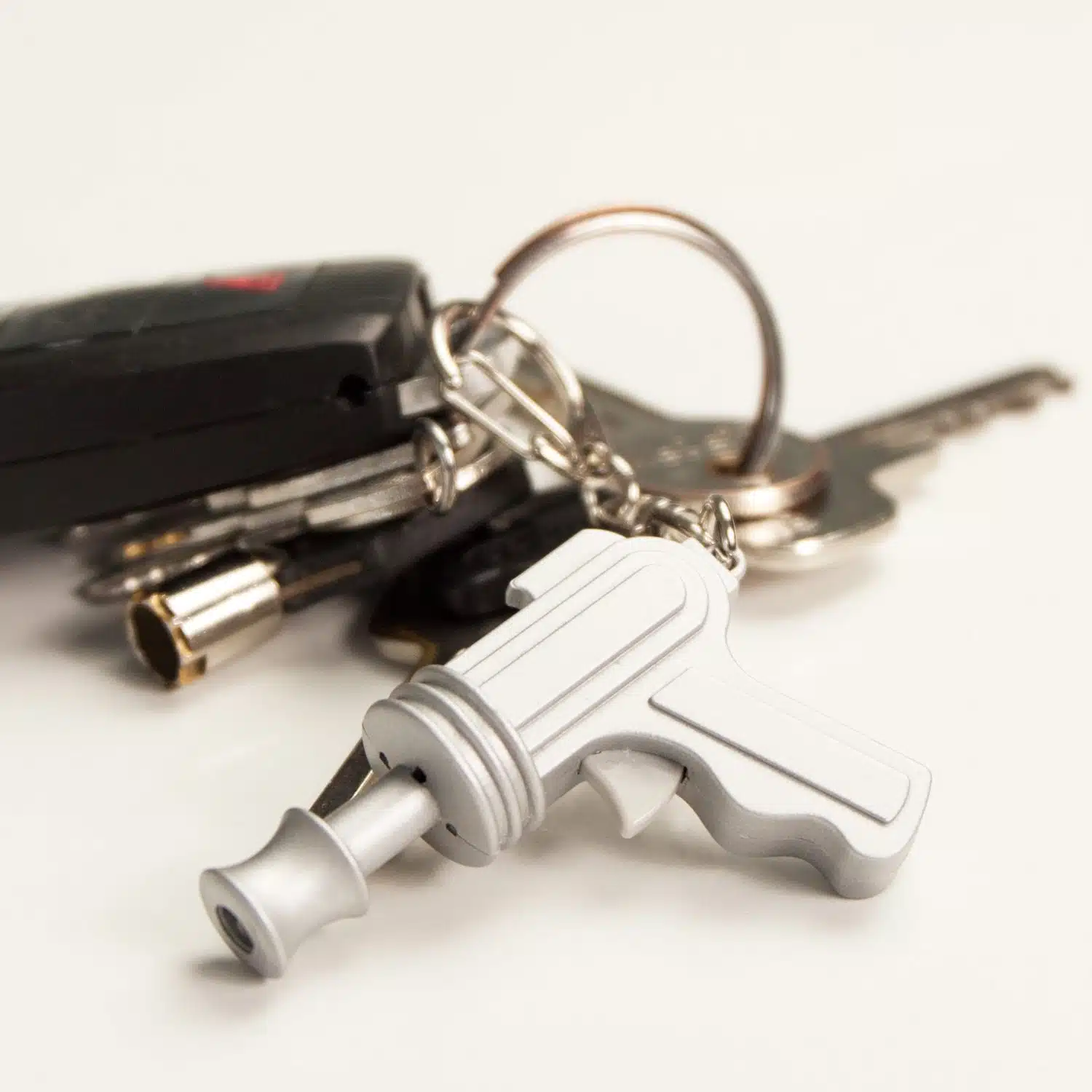 Heb je altijd al met een ruimtepistool willen schieten? Met deze Space gun sleutelhanger van Kikkerland wordt je droom werkelijkheid! Deze futuristische lasergun mag dan wel een klein formaat hebben, hij maakt wel levensechte geluiden en heeft zelfs een laserstraal! Deze lichtgrijze Space gun hang je als sleutelhanger aan je sleutels, maar kan door de handige karabijnhaak ook aan je broek, tas of jas bevestigd worden. Als je aan de trekker van het ruimtepistool zit dan hoor je een echte lasersound en komt licht uit de gun.
