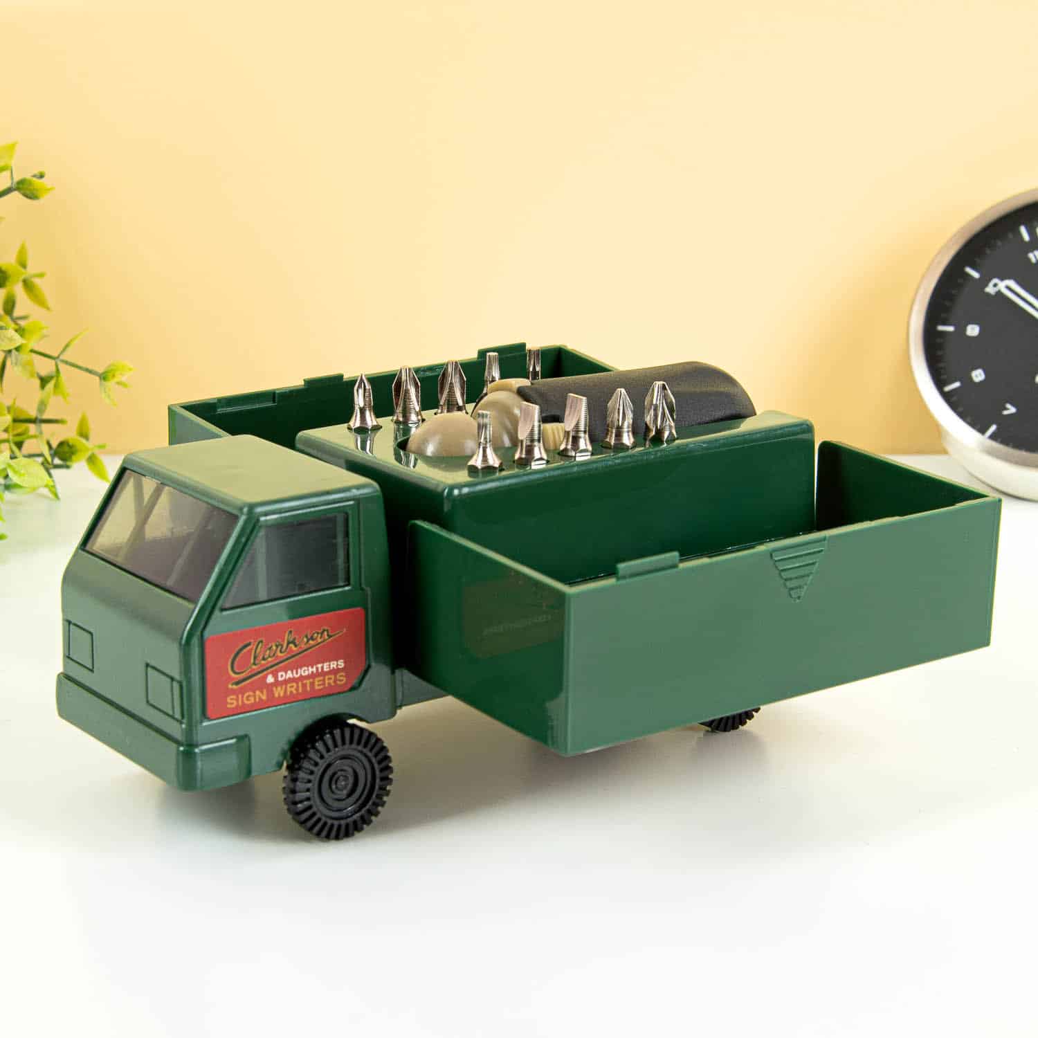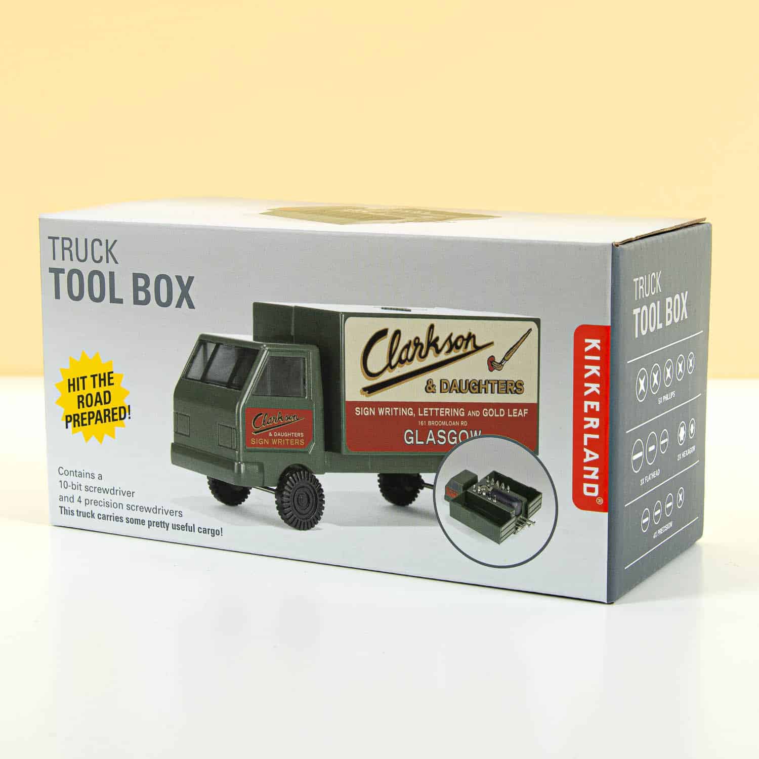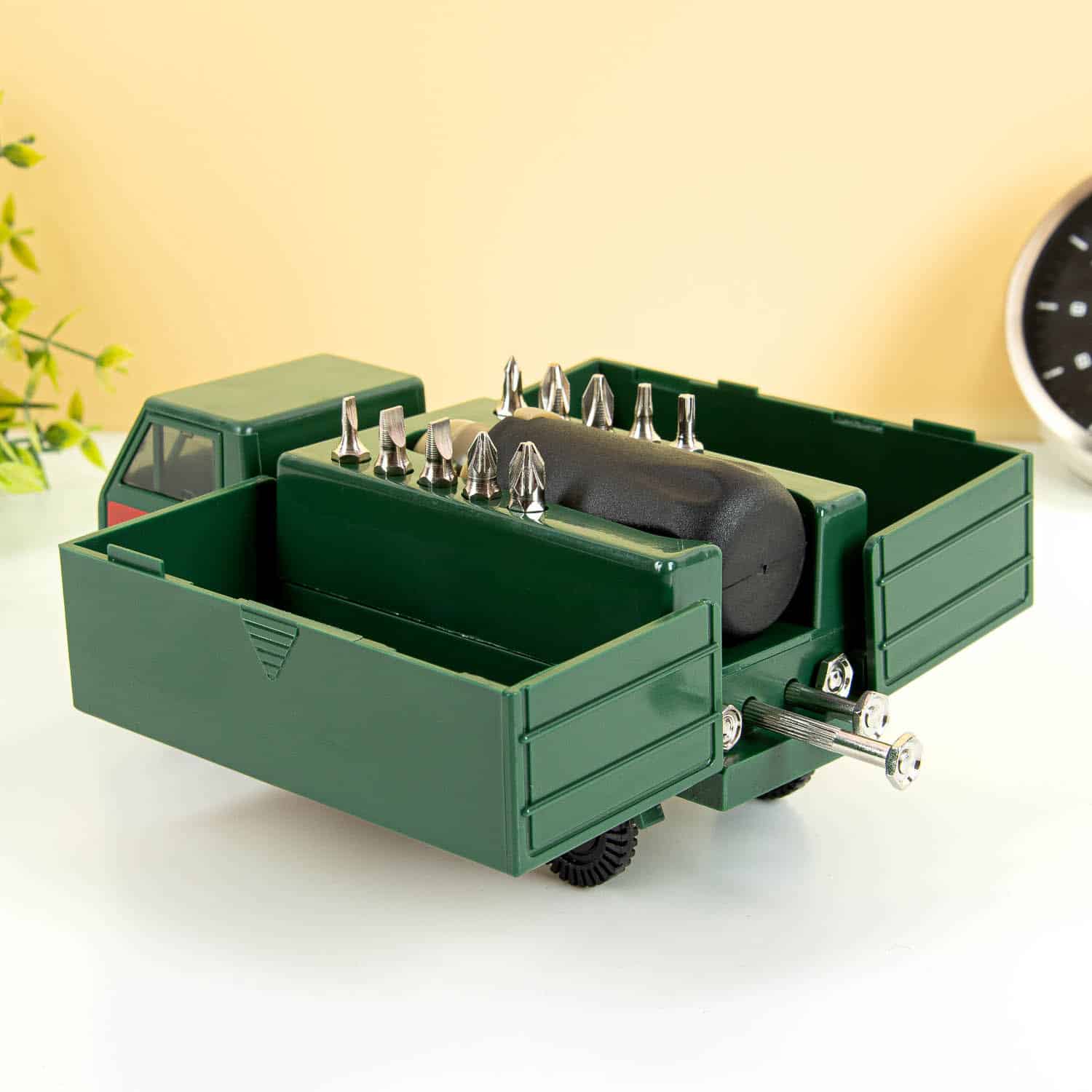 Het is altijd fijn om de juiste tools bij je te hebben als je op weg gaat. Wat als je midden in de winter stil komt te staan met een lege accu? Dan heb je startkabels nodig. En ga je naar het strand? Dan wil je je auto koel houden met een zonnescherm. De Truck toolkit van Kikkerland is een ideaal accessoire voor in je auto én voor thuis. Deze gereedschapsset in de vorm van een vrachtwagen bevat allerlei handig gereedschap: een schroevendraaier set in met tien bitjes en vier precisieschroevendraaiers. Ben je bij een vriend(in) en moet er iets aangeschroefd worden? Haal je Truck toolkit uit de kofferbak en wees de redder in nood!