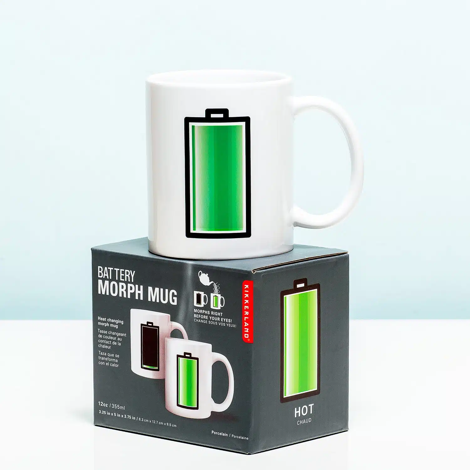 Ben je nog niet helemaal wakker? Begin je dag volledig opgeladen met de Warmtegevoelige mok Batterij van Kikkerland. Schenk je warme drank in de beker en de batterij laadt zichzelf op. Het zwarte balkje wordt door de warmte langzaamaan steeds groener. Als de drank afkoelt of de mok leeg is, wordt de batterij vanzelf weer zwart. De beker mag dan een lege batterij hebben, die van jou is tenminste helemaal opgeladen. Met de Kikkerland-mok Batterij met thermografische inkt heb je nooit meer een lege batterij. Verandert de batterij terug naar zwart, drink dan snel je warme drank op om er weer tegenaan te kunnen.