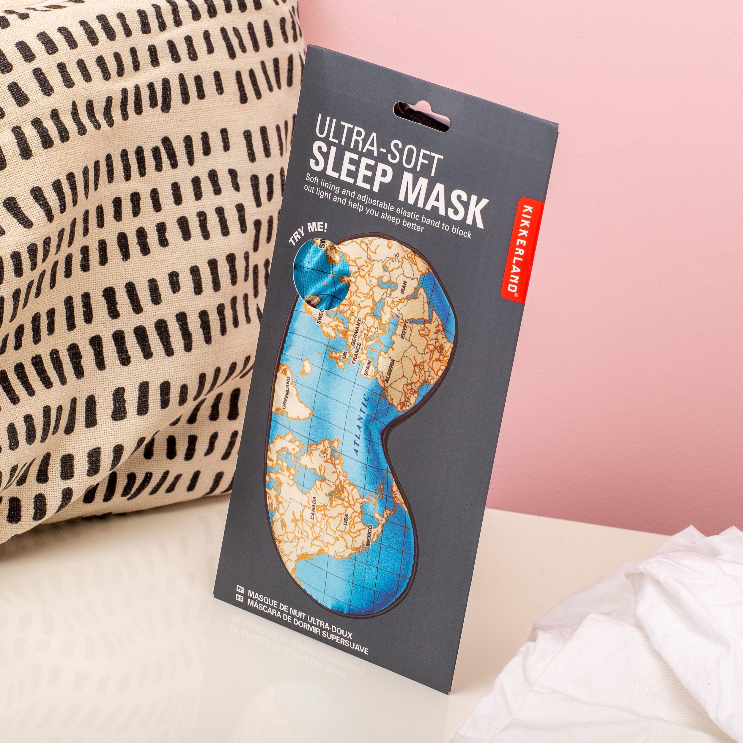 Ben jij zo’n geluksvogel die de hele wereld overvliegt? Voor iedereen die dol is op reizen hebben we wat leuks: een Wereldkaart slaapmasker van Kikkerland. Op de voorkant van dit slaapmasker staat de wereldkaart afgebeeld. Het masker is heerlijk zacht en sluit goed aan op je ogen. Hierdoor sluit het het licht buiten en kun je makkelijker slapen in bijvoorbeeld het vliegtuig. Maar ook als je nachtdiensten werkt en dus overdag slaapt, is dit masker heel handig en slaap je beter. Door de verstelbare elastische band past het masker comfortabel bij iedereen.