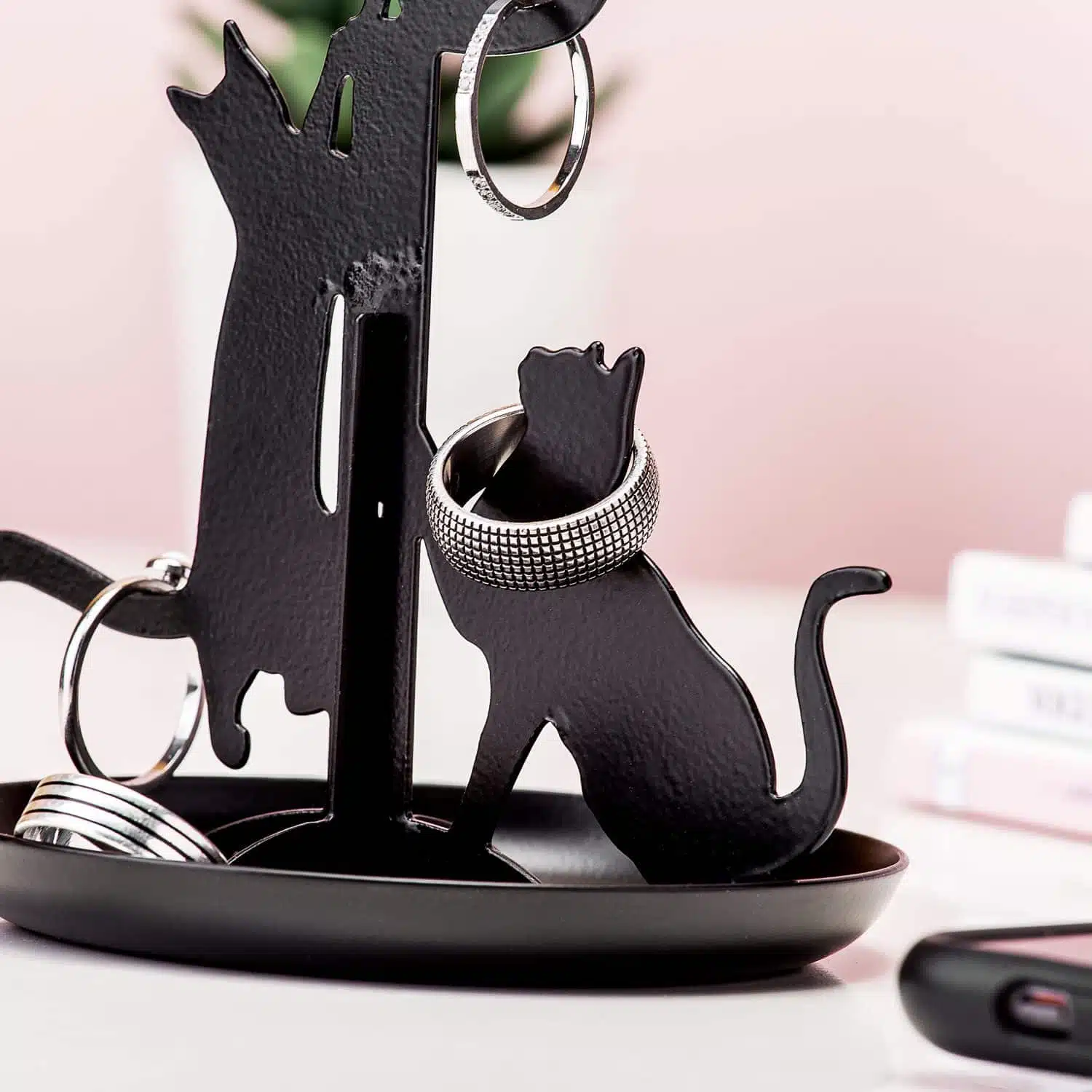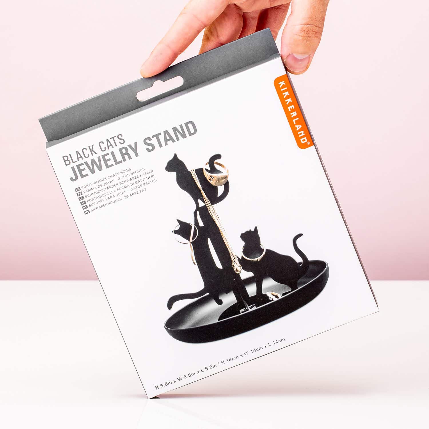 Vindt jouw kat het ook altijd fascinerend als je ring op tafel ligt? Voordat je het weet heeft je poezenbeest de ring van de tafel afgetikt of opgelikt. Als je dat liever niet hebt, dan kun je het beste je sieraden bewaren op deze Zwarte kat sieradenhouder van Kikkerland. Dit is een sieradenhouder in kattenvorm. Deze drie katten zorgen ervoor dat je sieraden veilig zijn. Hang je ringen voortaan om de kattenkopjes en -staarten van de sieradenhouder zodat je eigen kat er niet mee vandoor kan gaan. Met deze sieradenhouder heb je voortaan één vaste plek voor al je sieraden.