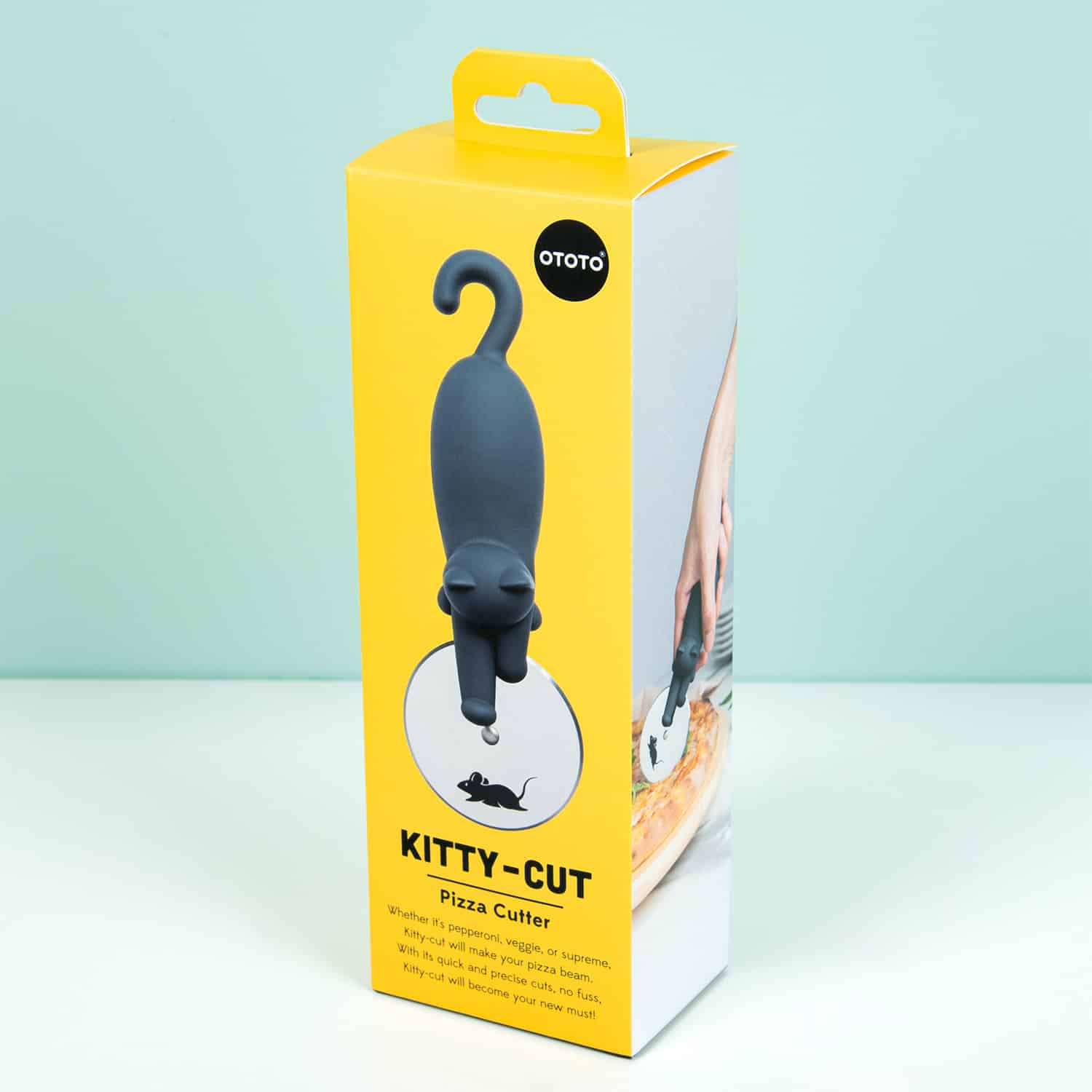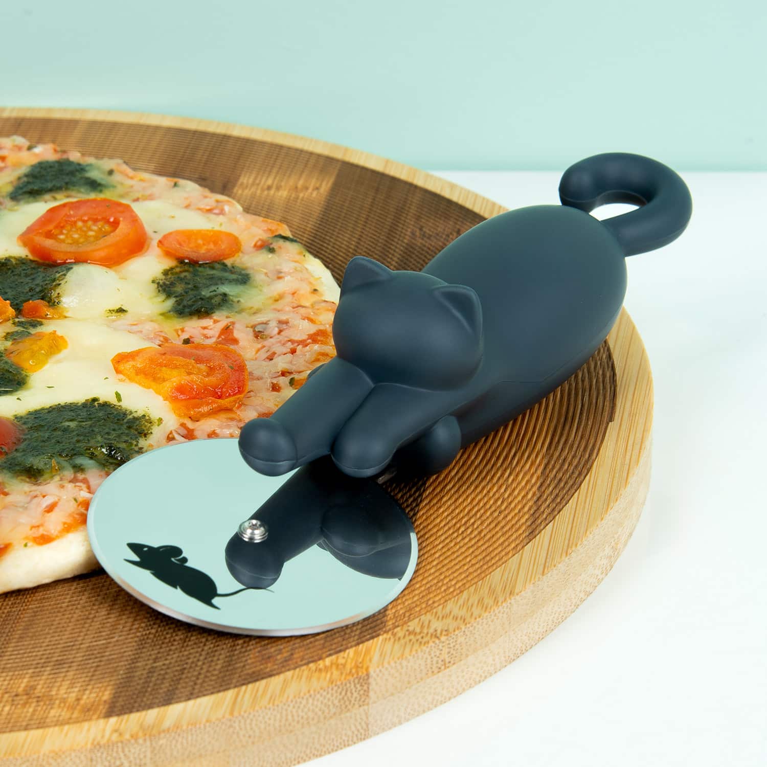 De Kitty pizzasnijder van Ototo snijdt niet alleen je pizza, maar zorgt er ook voor dat je keuken muisvrij blijft. De kat die het handvat van de pizzasnijder vormt, rent namelijk het muisje op het wiel achterna. Deze grappige pizzasnijder is een aanwinst voor iedereen die regelmatig zelf pizza’s bakt. En omdat ‘ie te grappig is om in een lade te verstoppen, kun je de kat aan zijn staart ophangen.