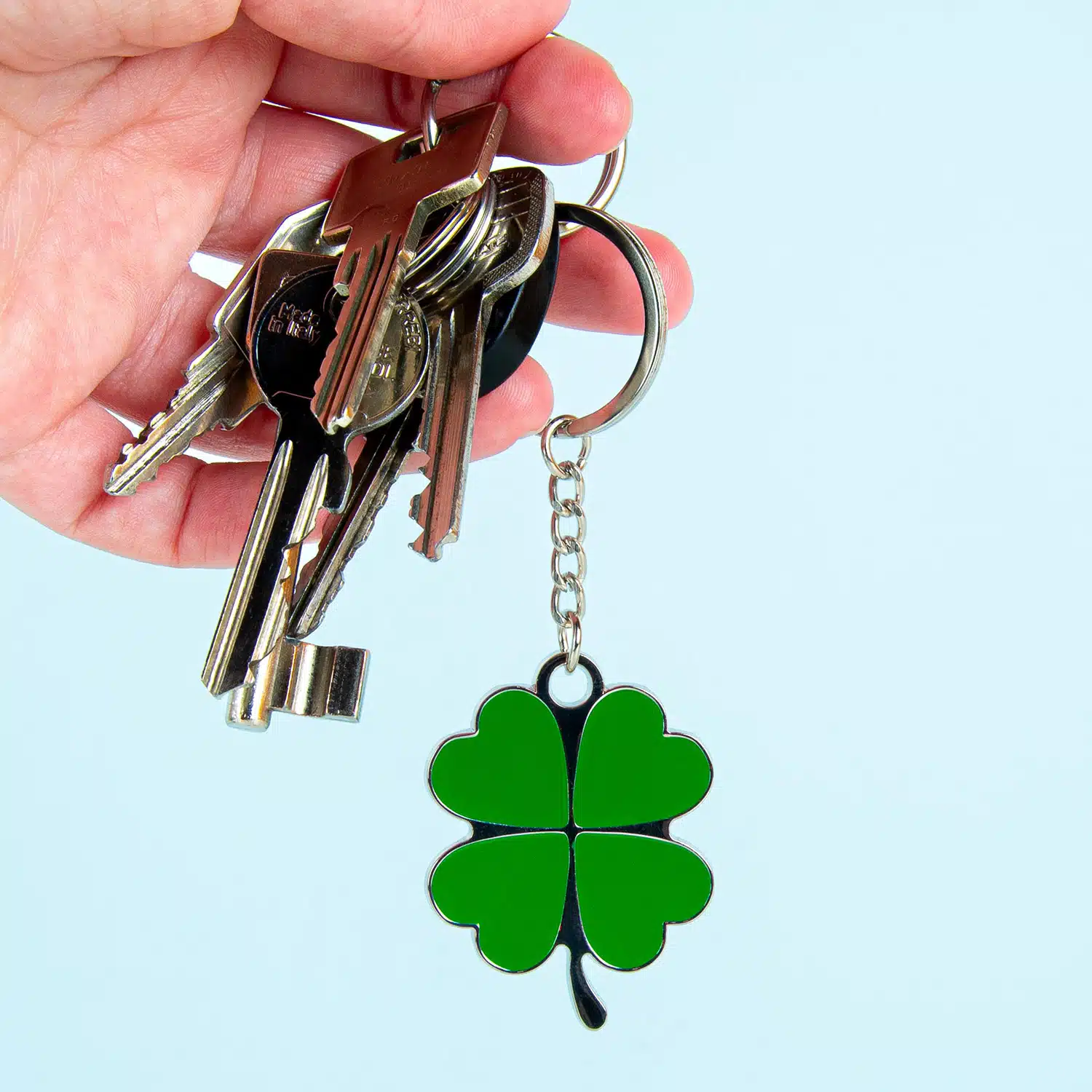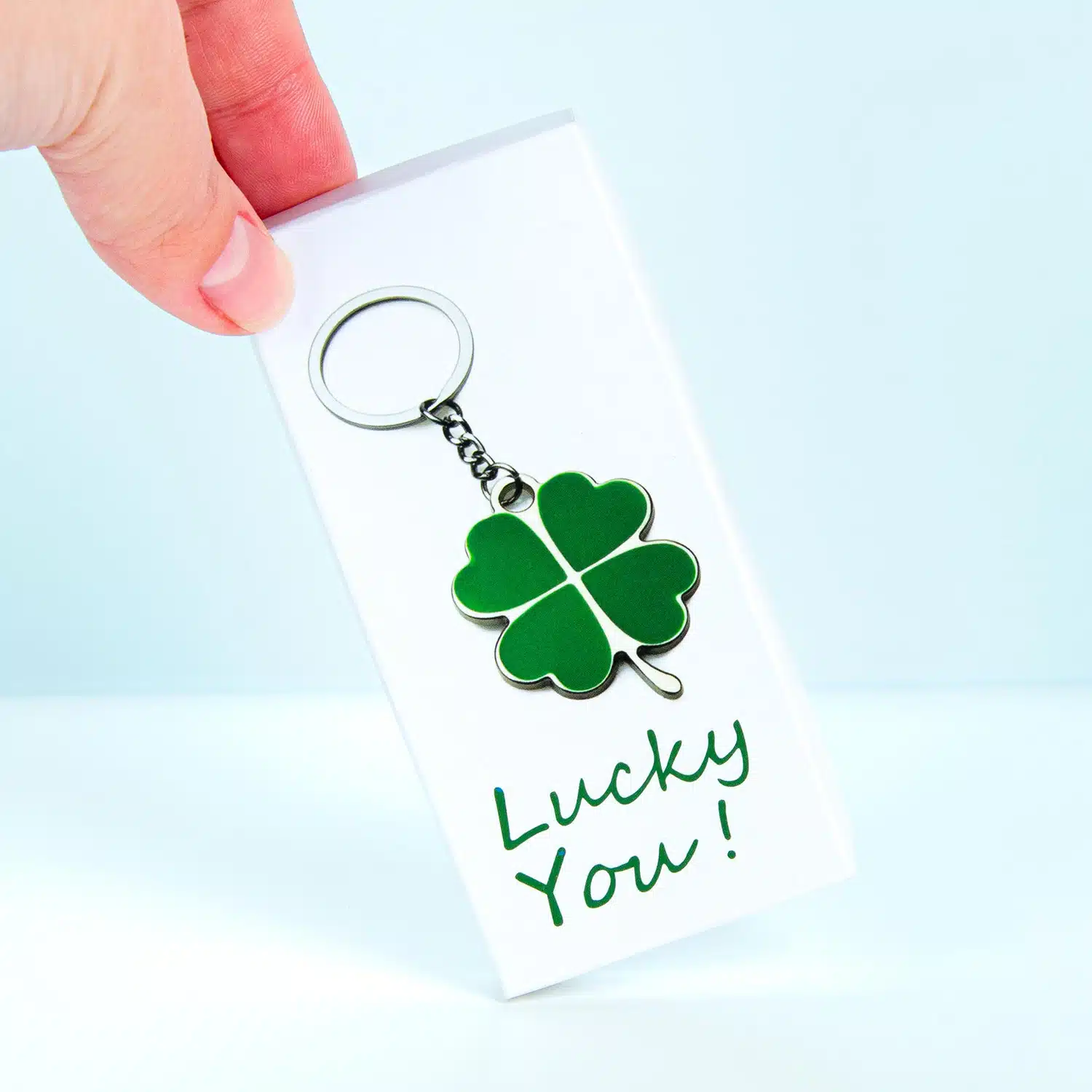 Sleutelhanger met daaraan een klavertje vier. Leuk en klein cadeautje om iemand geluk te wensen. En met een beetje mazzel raak je met deze sleutelhanger nooit meer je sleutelbos kwijt.